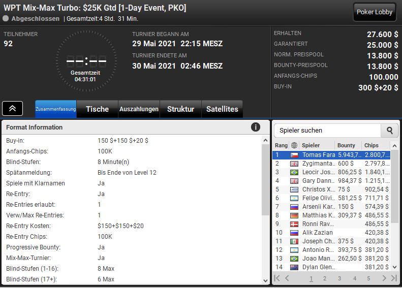 Als Side Event wurde ein $320 NLHE Mix-Max angeboten bei dem sich der Tscheche Tomas Fara durchsetzen konnte und neben $2.800 Prämie auch $5.943 an Bounties abräumte. Matthias Kribben belegte Platz acht für $86 Preisgeld plus $309.