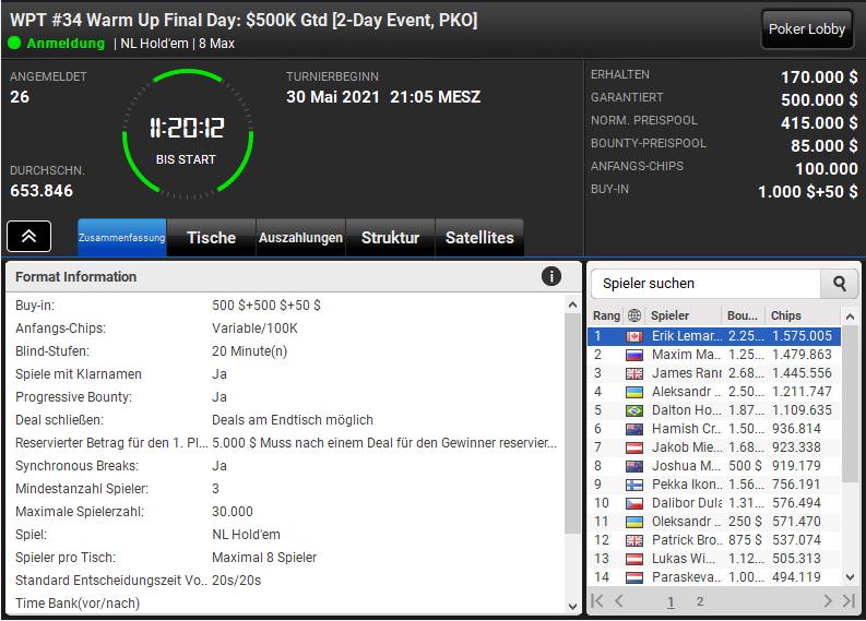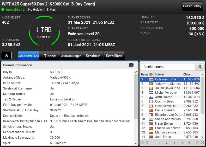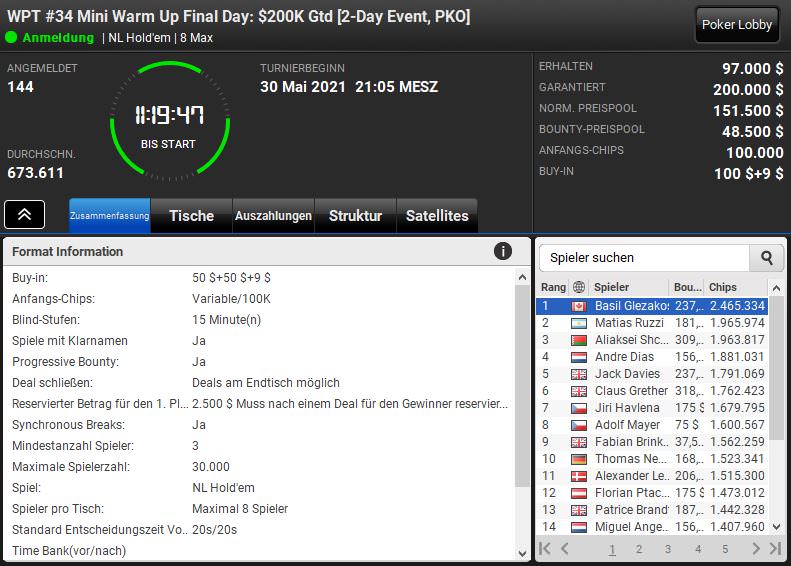 Auch am Samstag gab es bei der World Poker Tour (WPT) Online Series auf partypoker nur eine Entscheidung, stattdessen bestimmten erneut die Starttage bei Warm Up, WPT500 Super50 und Super5 im Blickpunkt.
