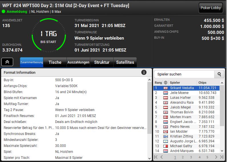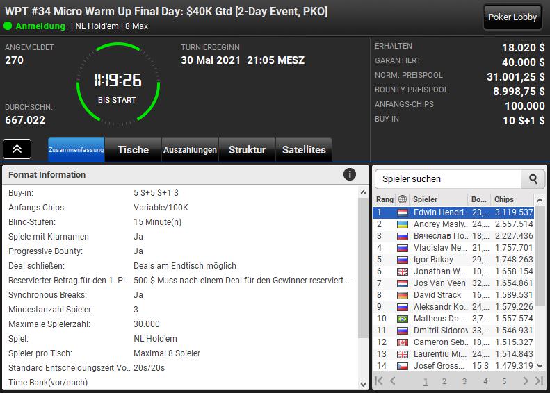 Jakob Miegel hat sich dann auch noch eine gute Ausgangsposition beim $1.050 Warm Up (#34) erspielt. Er beendete Day 1B mit 923.338 Chips ab und liegt bei aktuell 26 für Tag 2 qualifizierten Spieler auf Platz 7.