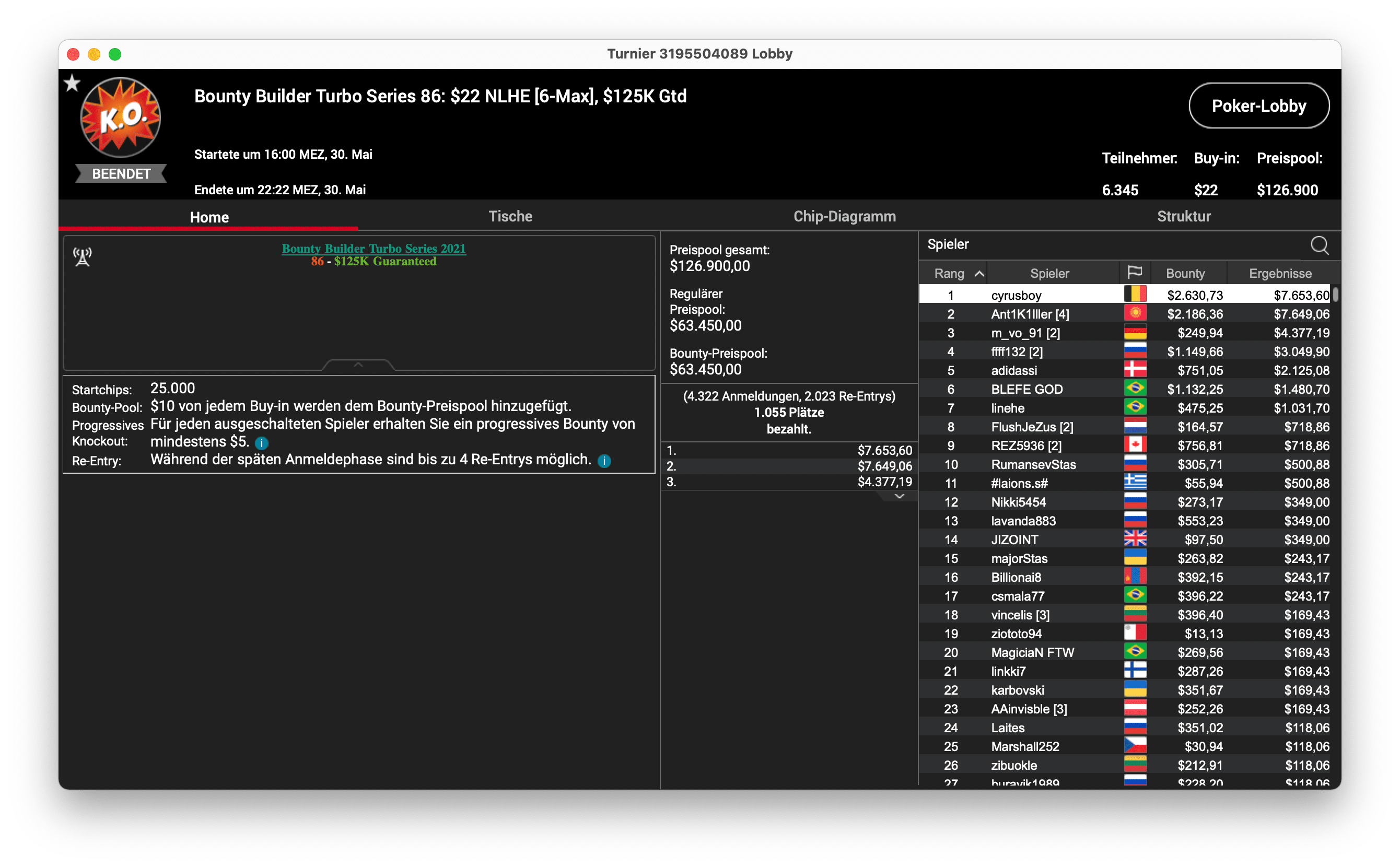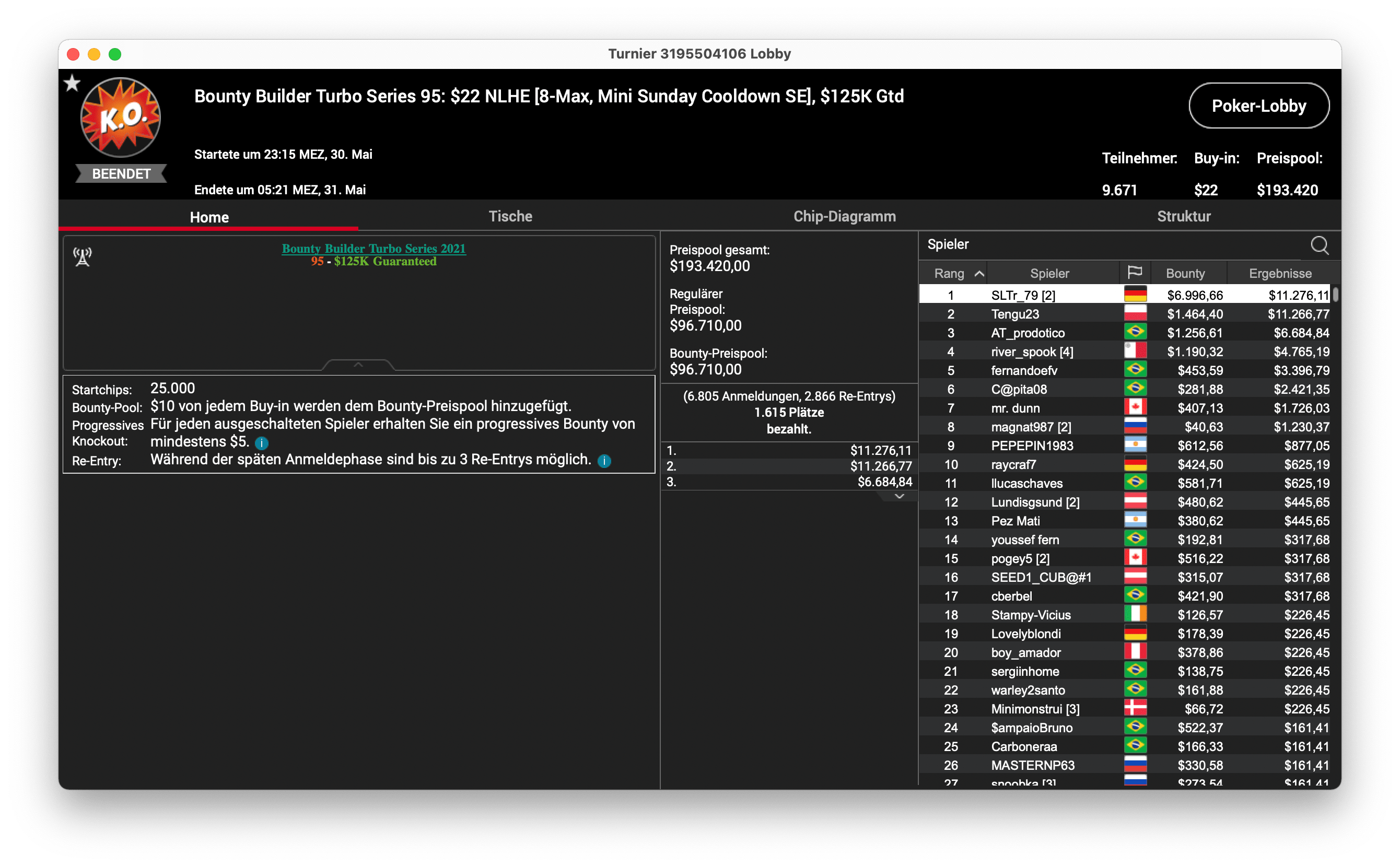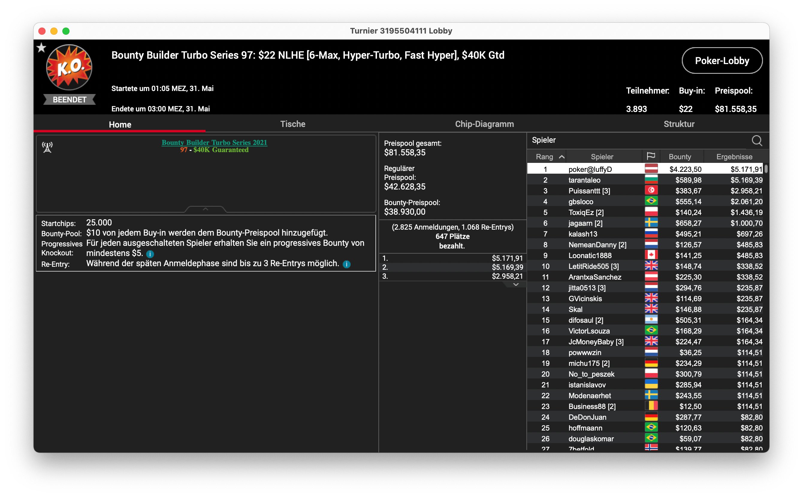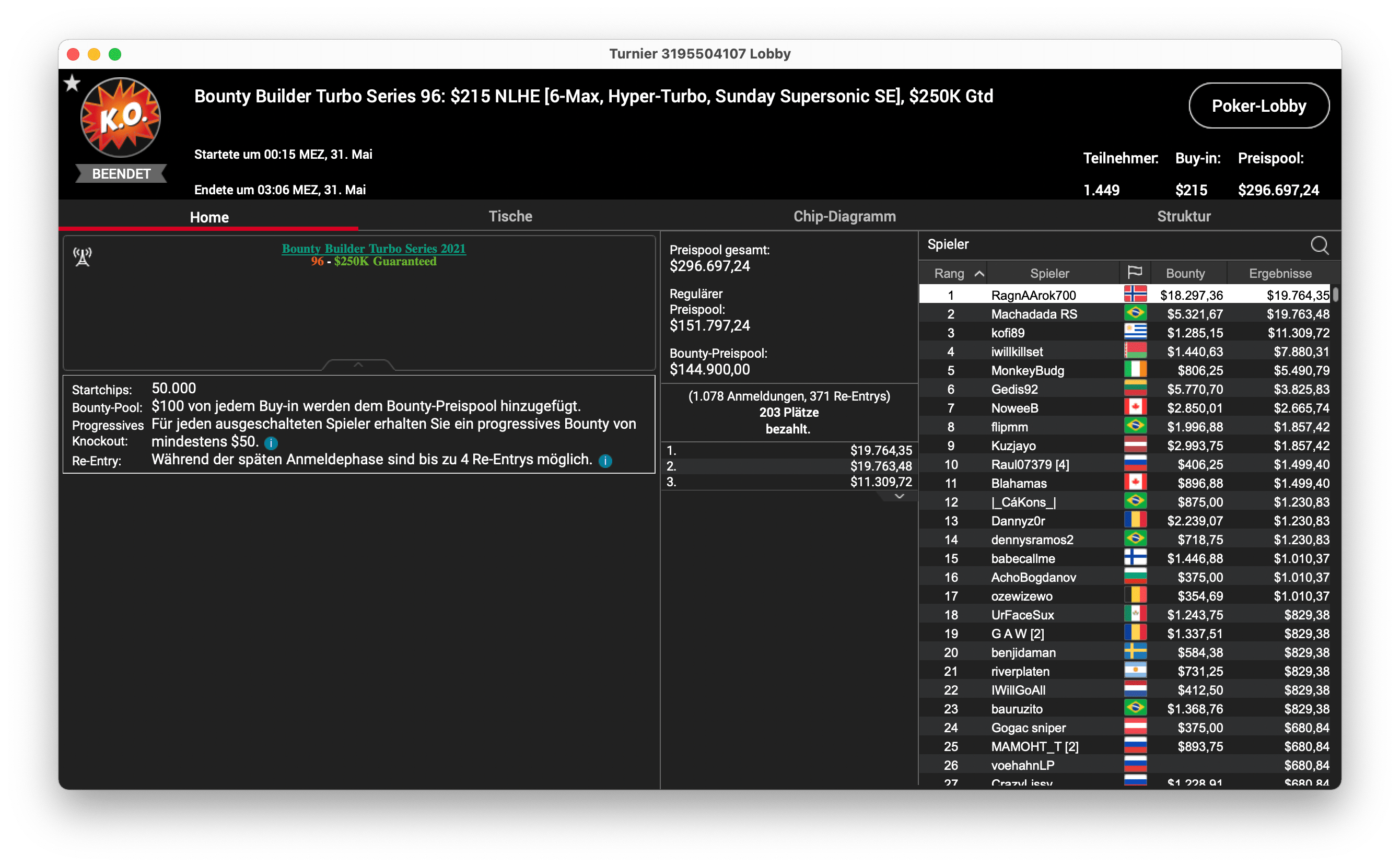 Das $22 Mini Sunday Cooldown mit 9.671 Entries und $193.420 Preispool ging an „SLTr_79“ aus Deutschland für $6.996 + $11.276. Lette Guntis „poker@luffyD“ Aleskins gewann das $22 6-Max Hyper Turbo gegen 3.892 gegnerische Entries. $4.223 + $5.171 gab es für den Titel.