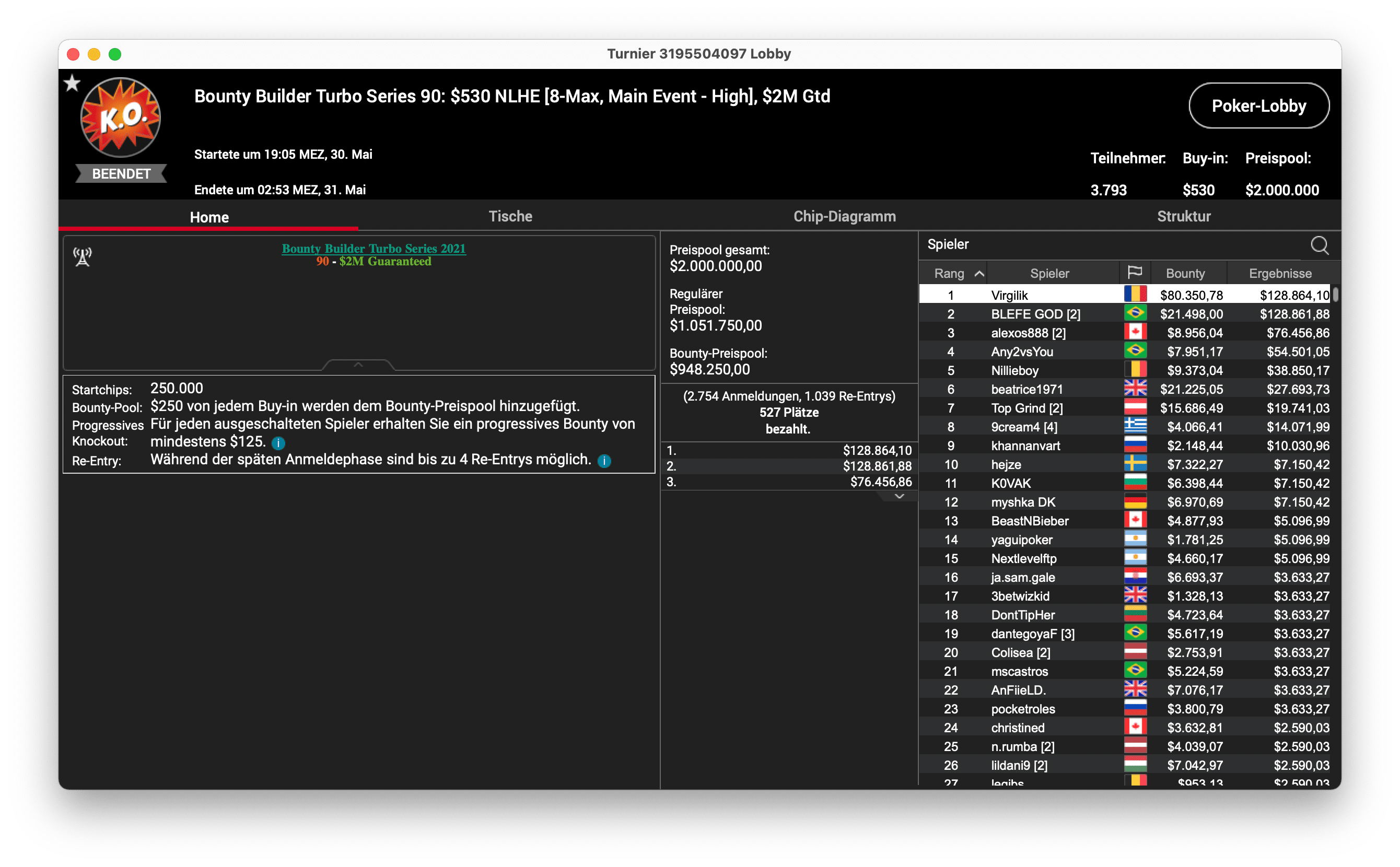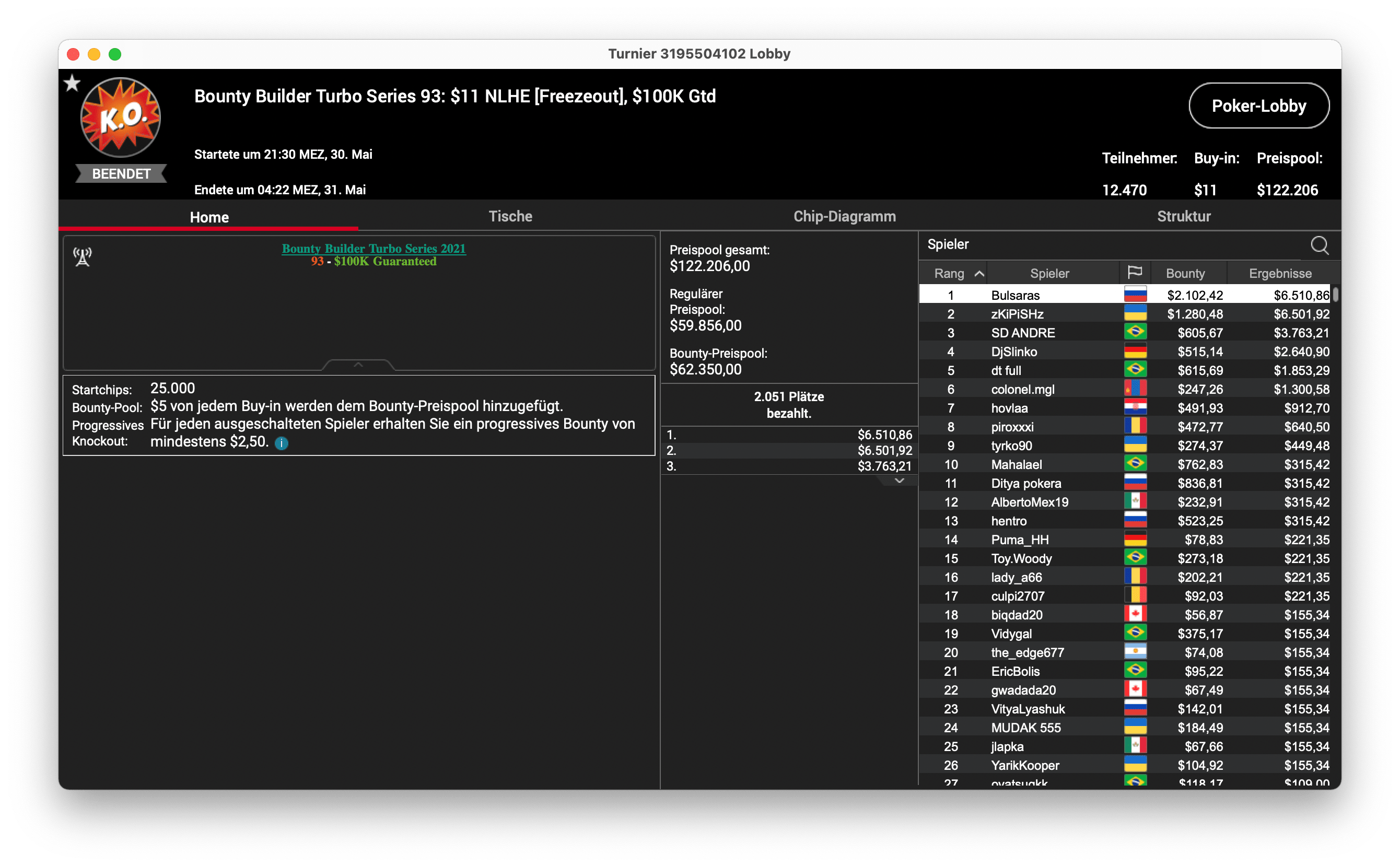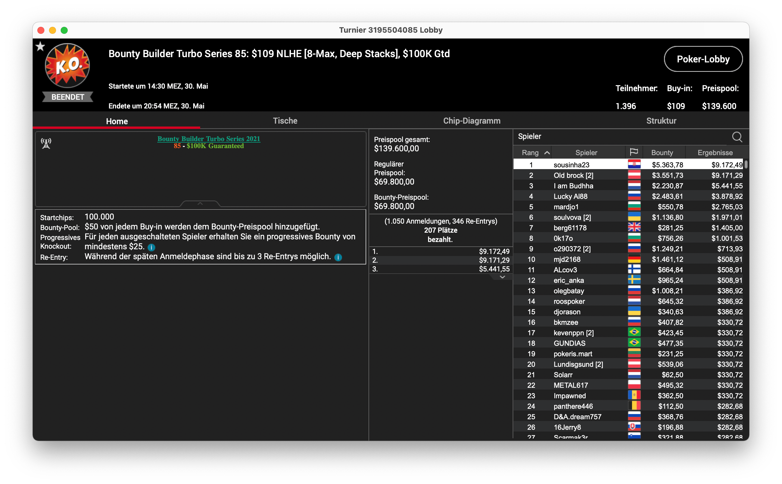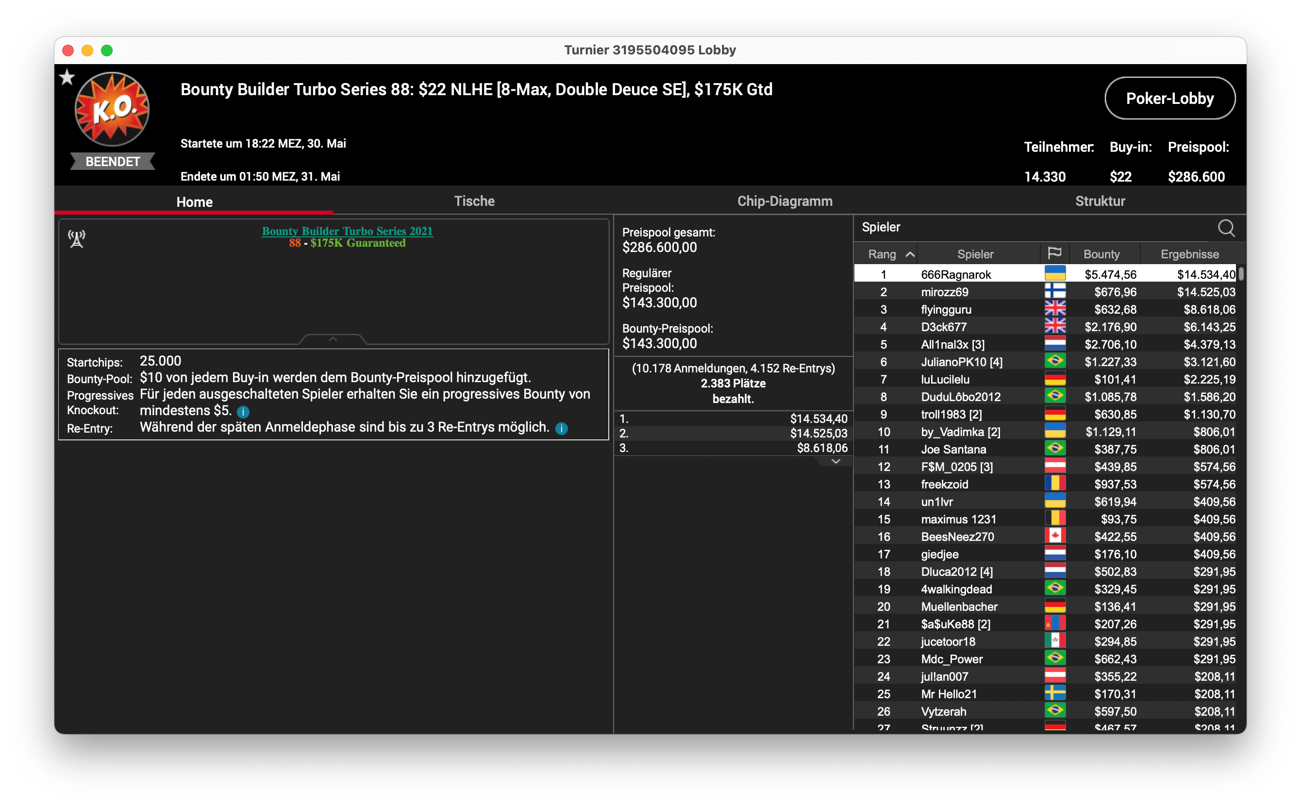 Das $22 Mini Sunday Cooldown mit 9.671 Entries und $193.420 Preispool ging an „SLTr_79“ aus Deutschland für $6.996 + $11.276. Lette Guntis „poker@luffyD“ Aleskins gewann das $22 6-Max Hyper Turbo gegen 3.892 gegnerische Entries. $4.223 + $5.171 gab es für den Titel.
