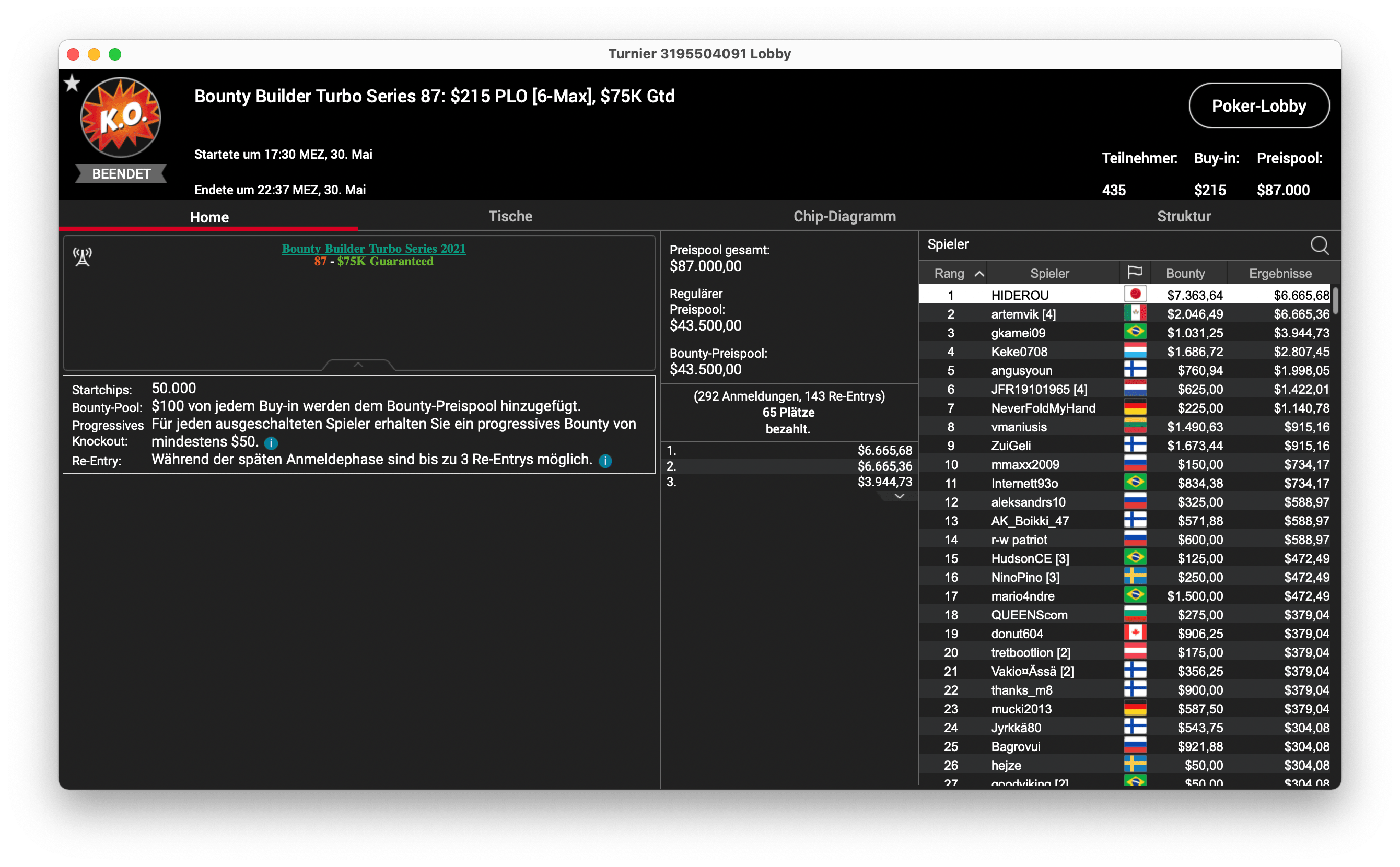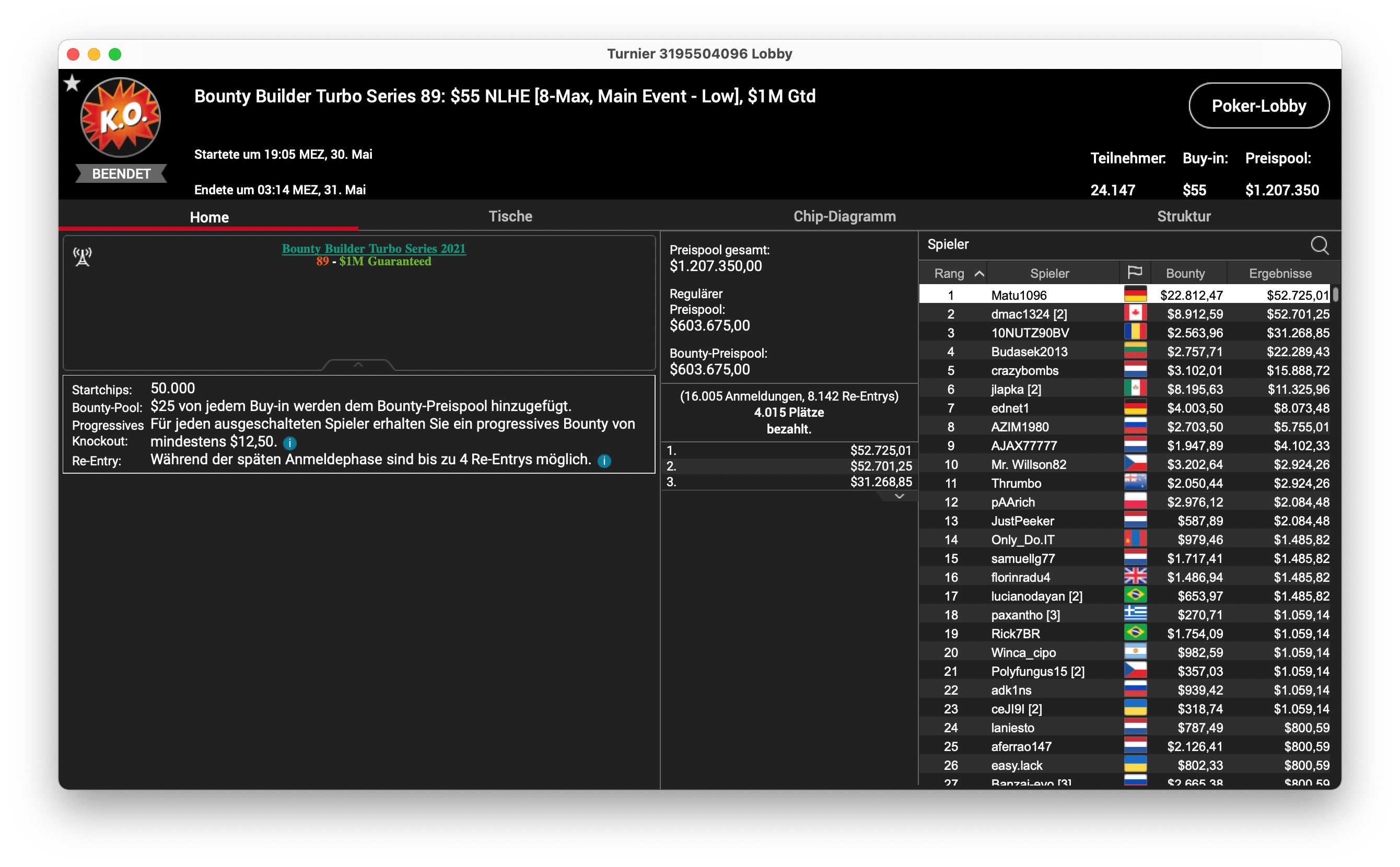 24.146 Entries konnte „Matu1096“ hinter sich lassen. Dafür gab es aus dem $1.207.350 großen Preispool $22.812 + $52.725 für den Sieg bei nur $55 Buy-In. Zweiter wurde der Kanadier „dmac1324“ für $8.912 + $52.701.