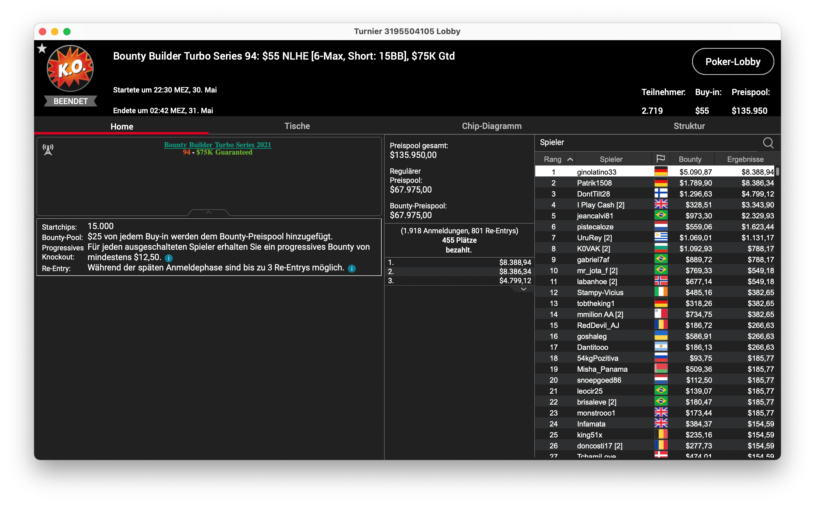 Das $55 NLHE 6-Max Short: 15BB ging ebenfalls nach Deutschland. Die Landsmänner „ginolatino33“ und „Patrik1508“ machten im Heads-Up den Sieger untereinander aus. „ginolatino33“ ging als Gewinner aus dem Duell, er durfte sich über $5.090 + $8.388 freuen, die Runner-Up-Platzierung brachte $1.789 + $8.386.