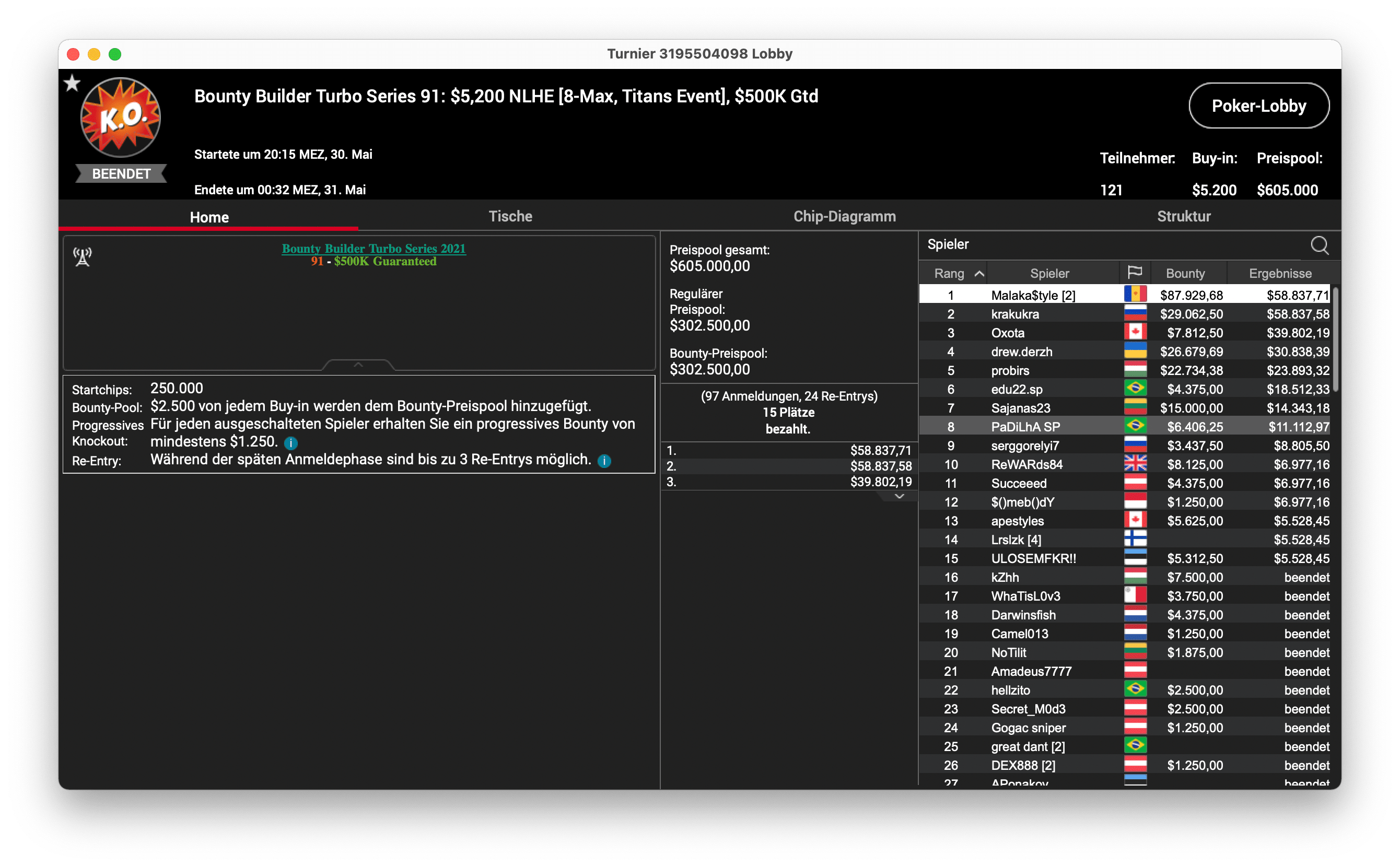 Das Top-Turnier der Tages war das $5.200 Titans Event, bei dem 121 Entries von 97 Spielern für $605.000 Preispool sorgten. Der Sieg ging an Juan „Malaka$tyle“ Pardo für $87.929 + $58.837. Konstantin „krakukra“ Maslak wurde Zweiter für $29.062 + $58.837. Bester DACH-Spieler wurde Jakob „Succeeed“ Miegel auf Platz 11 für $4.375 + $6.977.