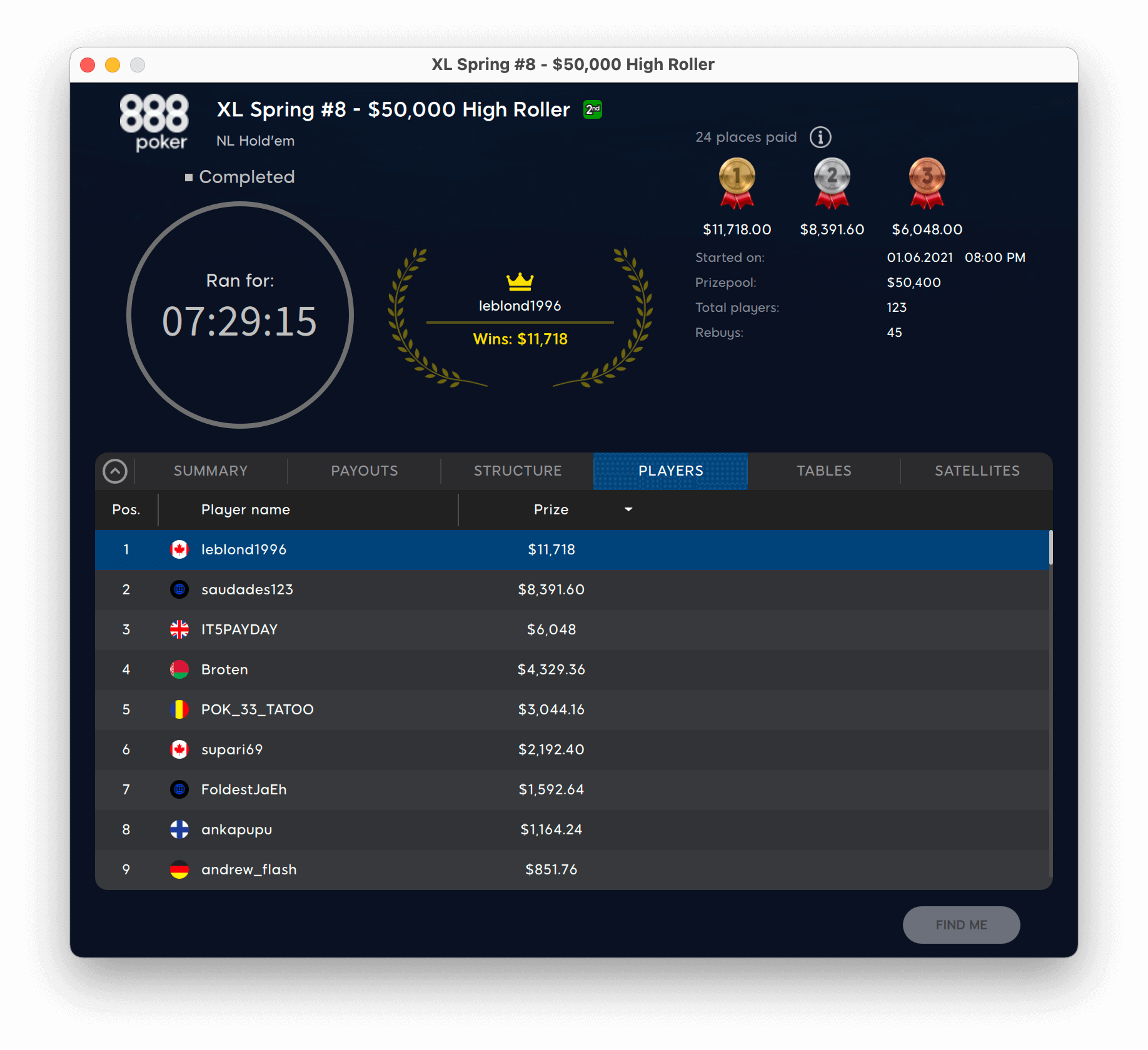 Event #8 das High Roller mit $320 Buy-In hatte eine $50.400 Garantie. 123 Spieler zogen 45 Re-Entries. Der Sieg ging an den Kanadier „leblond1996“ für $11.718.