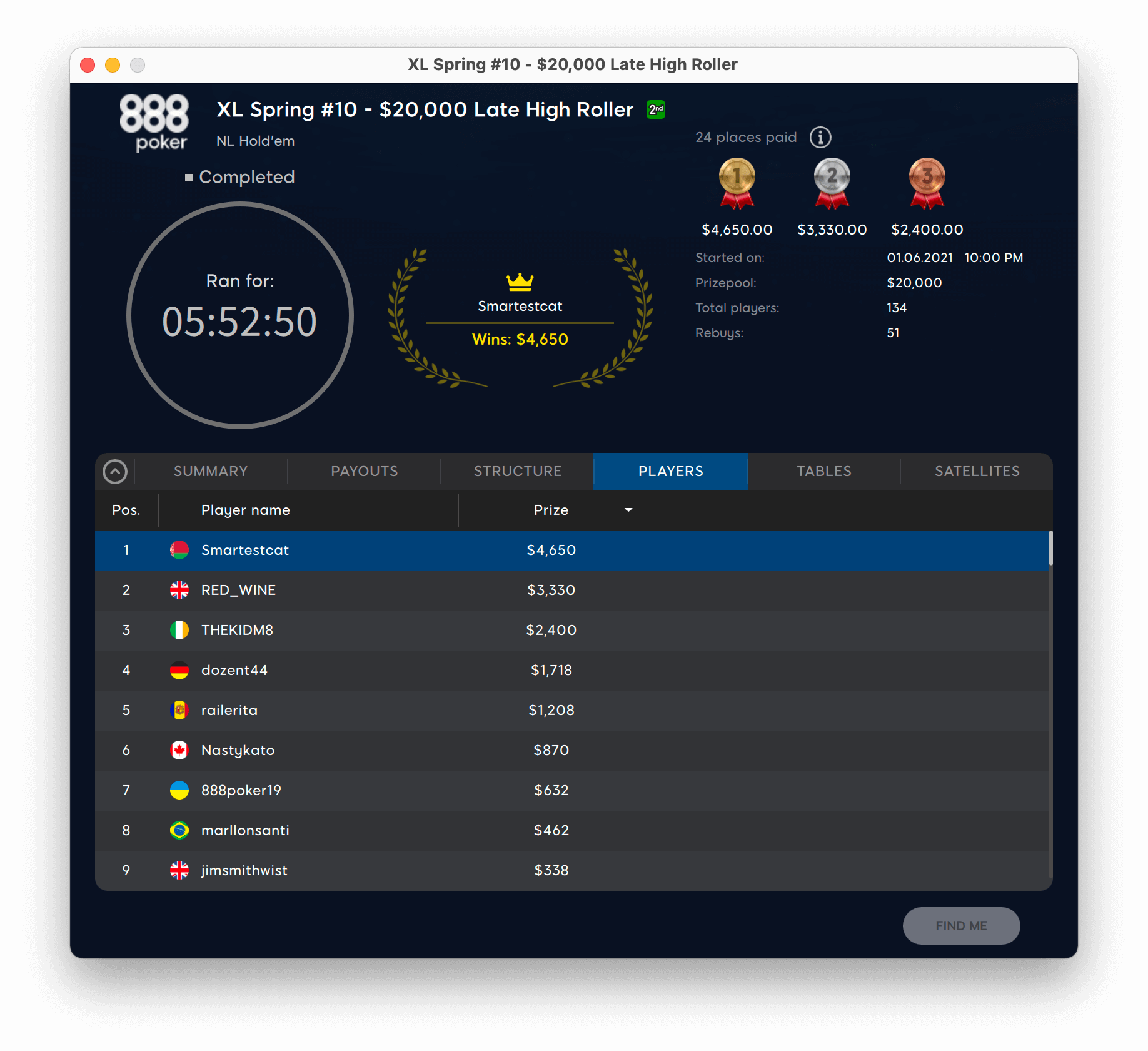 Das $109 Late High Roller hatte die garantierten $20.000 im Preispool. 134 Spieler sorgten hier für 51 Wiedereinkäufe. „Smartestcat“ konnte sich hier durchsetzten und wurde mit $4.650 belohnt.