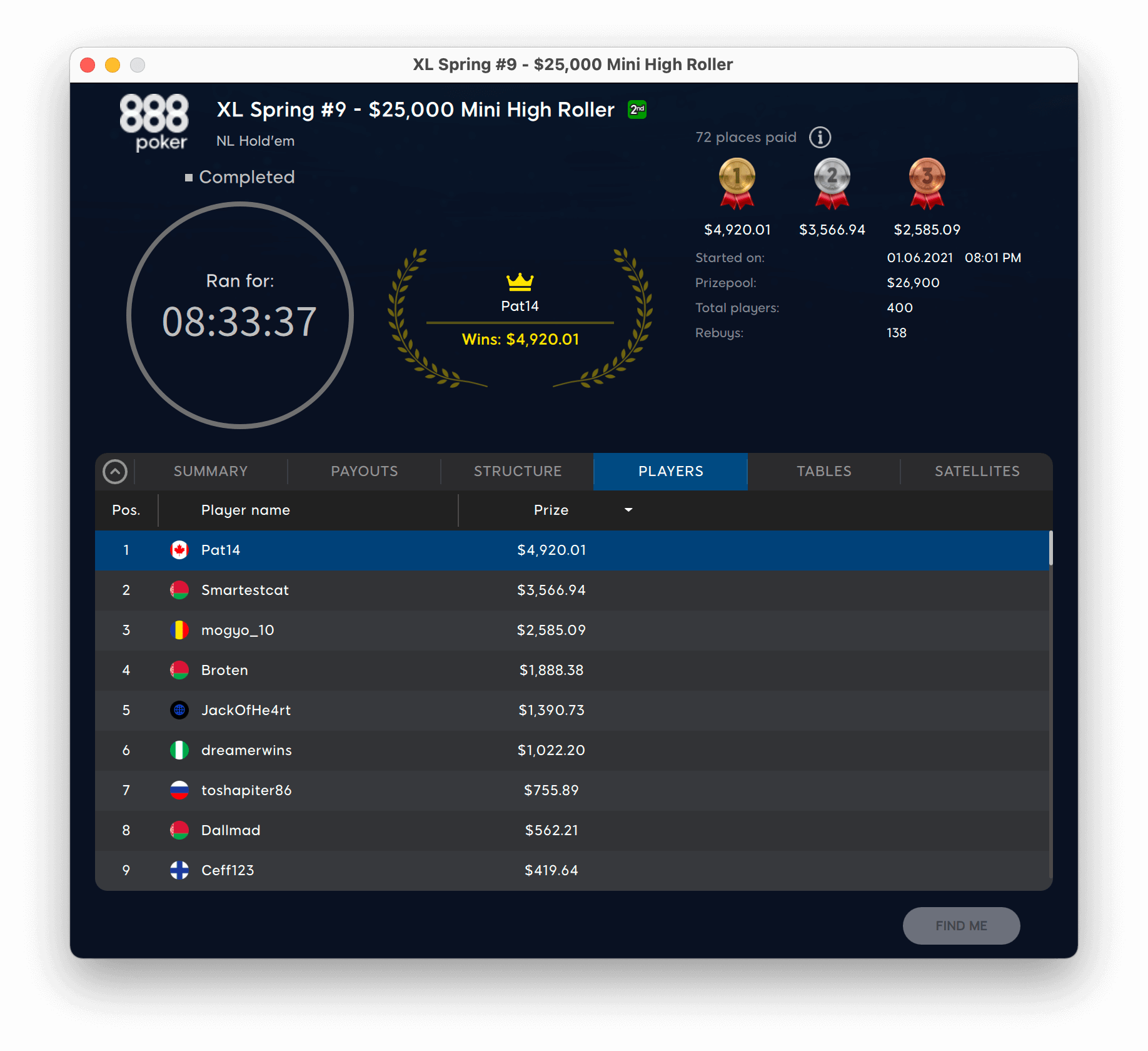 Beim Mini High Roller gab es $26.900 im Preispool durch Buy-Ins von 400 Spielern, die 138 Mal die Rebuy-Option nutzten. „Pat14“ fand sich am Ende an der Spitze wieder und durfte $4.920 einsacken.