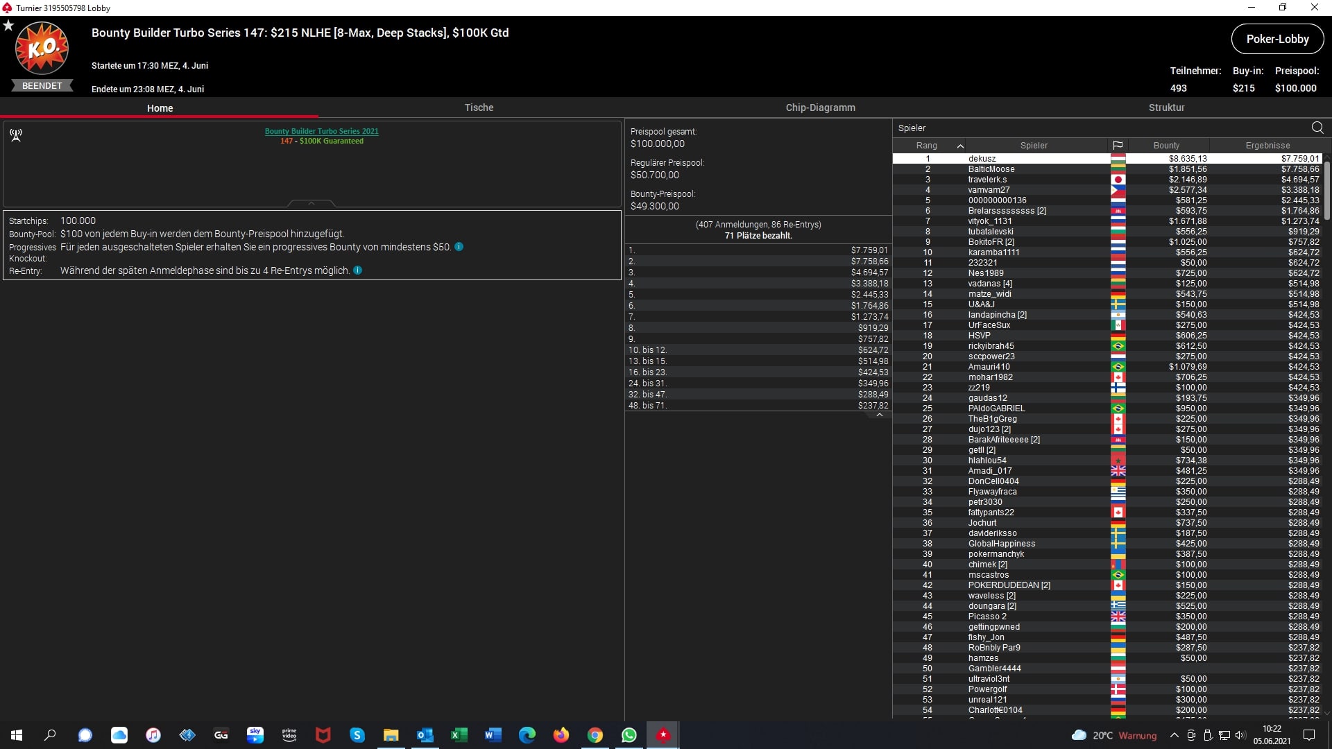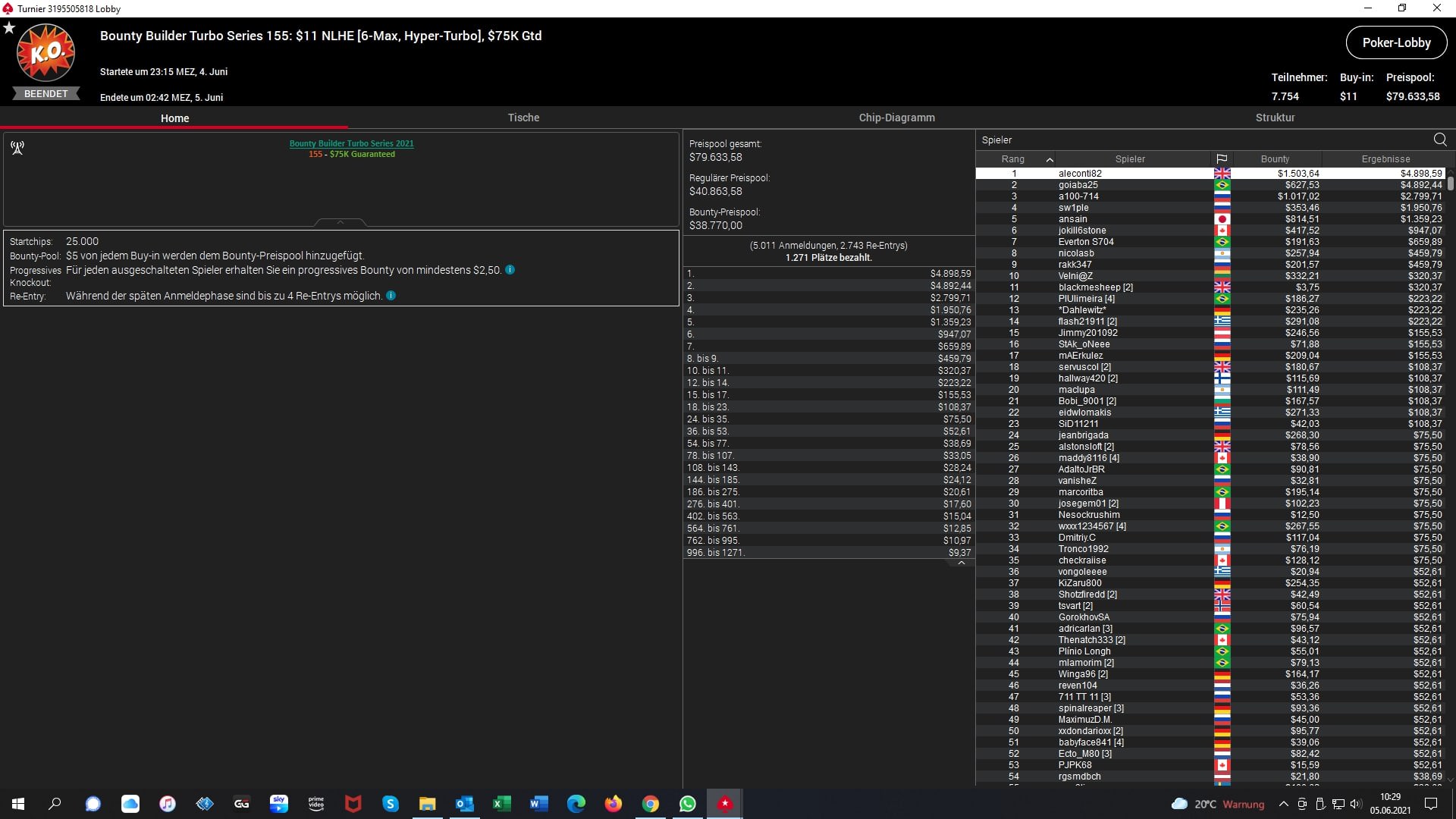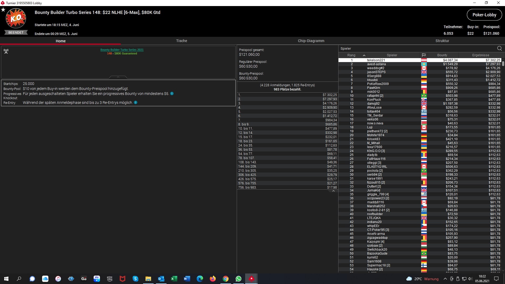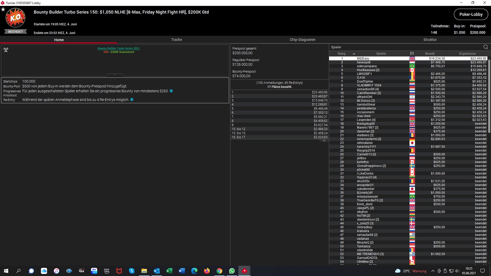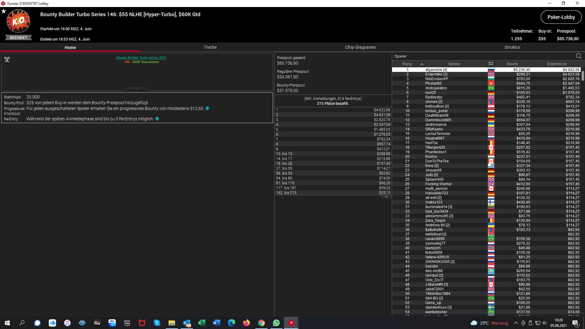 Platz 6 – #146 – $55 NLHE Hyper Turbo – „nuri25“ (GER) – $1.078 + $165 Bounties