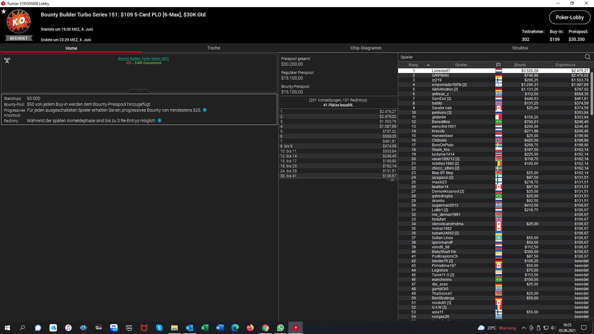 Platz 4 – #152 – $215 NLHE 6-Max – „SabiraPakvic“ (AUT) – $7.252 + $5.678 Bounties