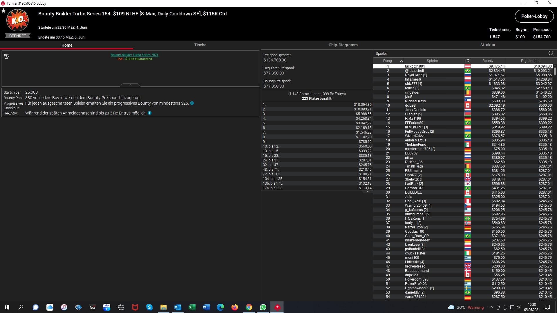 Den größten Cash der deutschsprachigen Teilnehmer konnte der Österreicher „luckbox1991“ beim $109 NLH 8-Max Daily Cooldown Event #154 verbuchen. Für den Sieg wurde er mit $10.094 + $9.475 Bounties entlohnt.