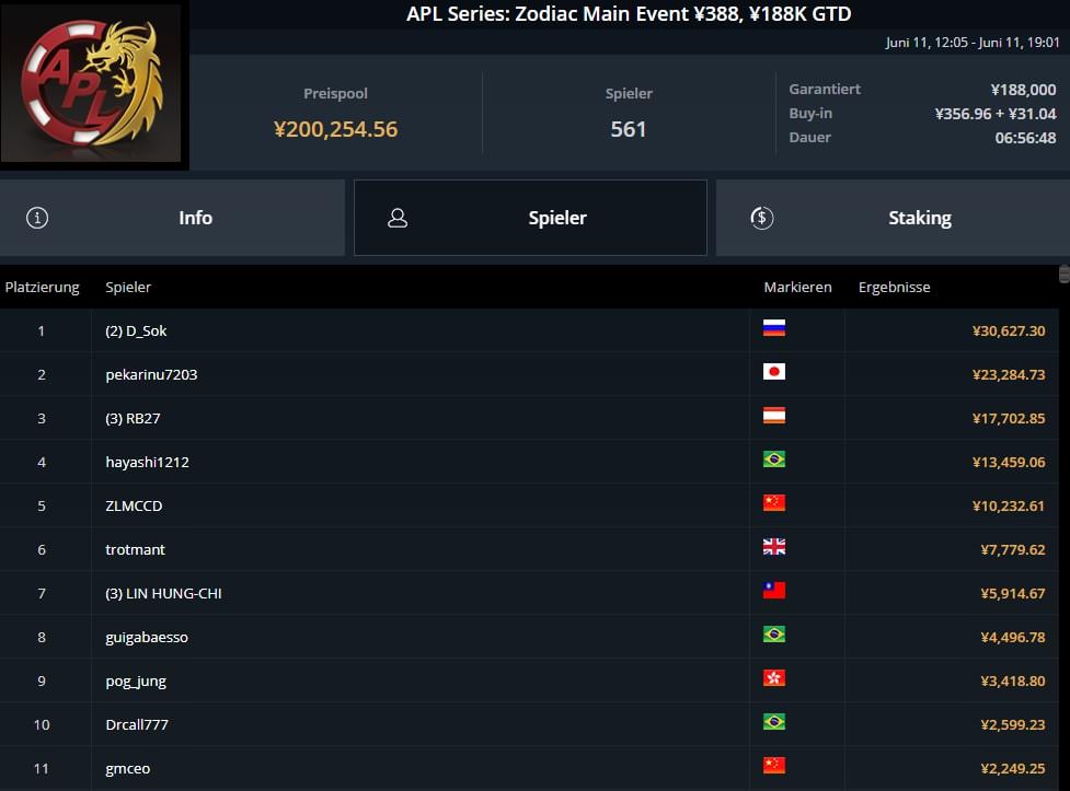 Platz 3 – ¥388 APL Series Zodiac Main Event – „RB27“ (AUT) – ¥17.702