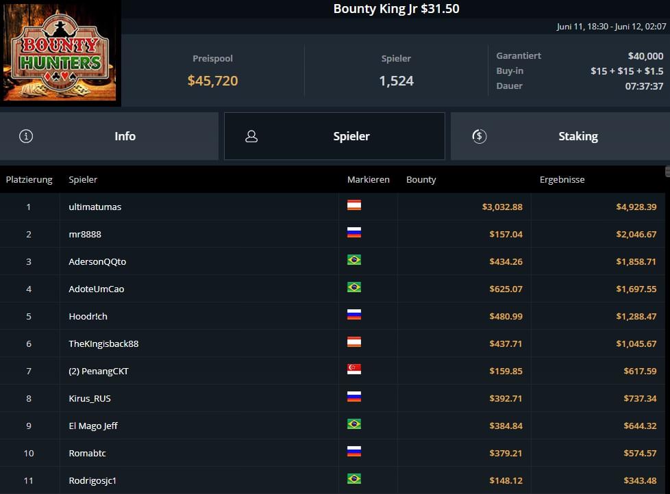 Ein Online-Grinder aus Österreich konnte aber auf sich aufmerksam machen. „ultimatumas“ holte sich den Sieg und $4.928 inkl. $3.032 Bounties beim $31,50 Bounty King Jr. und wurde anschließend noch Dritter für $2.703 beim $25 GGMasters Daily.