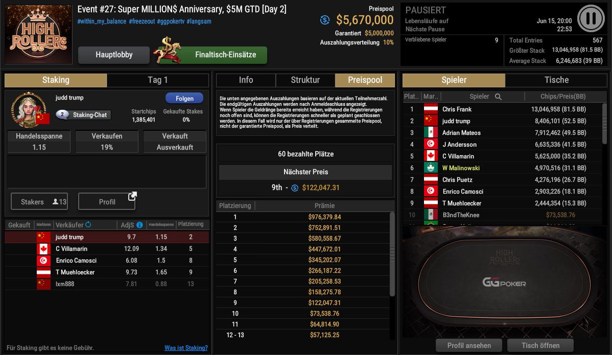 Zum zweiten Geburtstag des Super MILLION$ hatte GGPoker bei $10.300 Buy-in stolze $5 Millionen garantiert. Letztlich wurden an den fünf Starttagen aber 567 Entries registriert, sodass $5.670.000 im Preispool lagen.