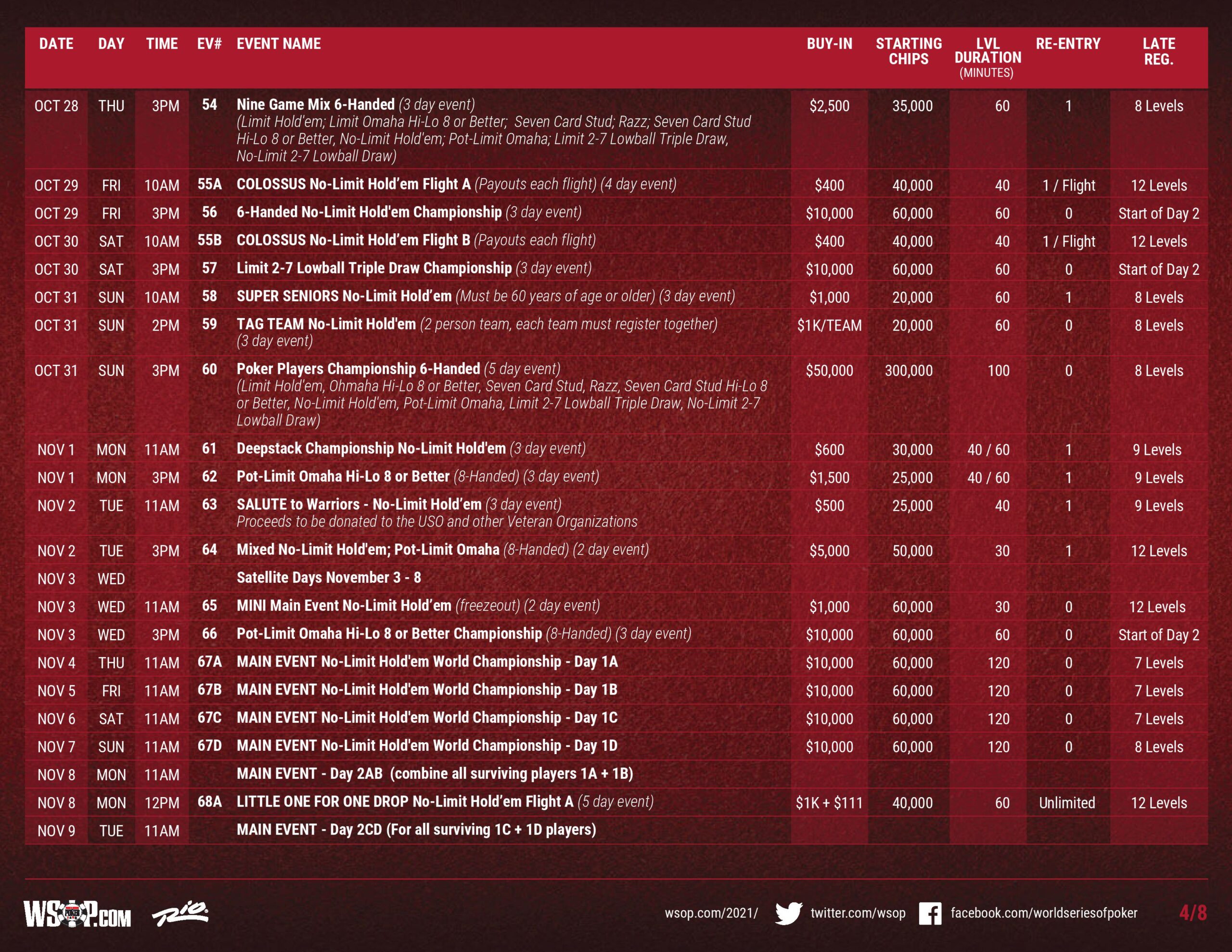 Der $10.000 WSOP Main Event (Poker Weltmeisterschaft) findet vom 04.- 17. November 2021 statt und hat dieses Mal vier Starttage Eins und zwei Starttage 2. Erst ab Tag 3 spielen alle verbliebenen Spieler zusammen.