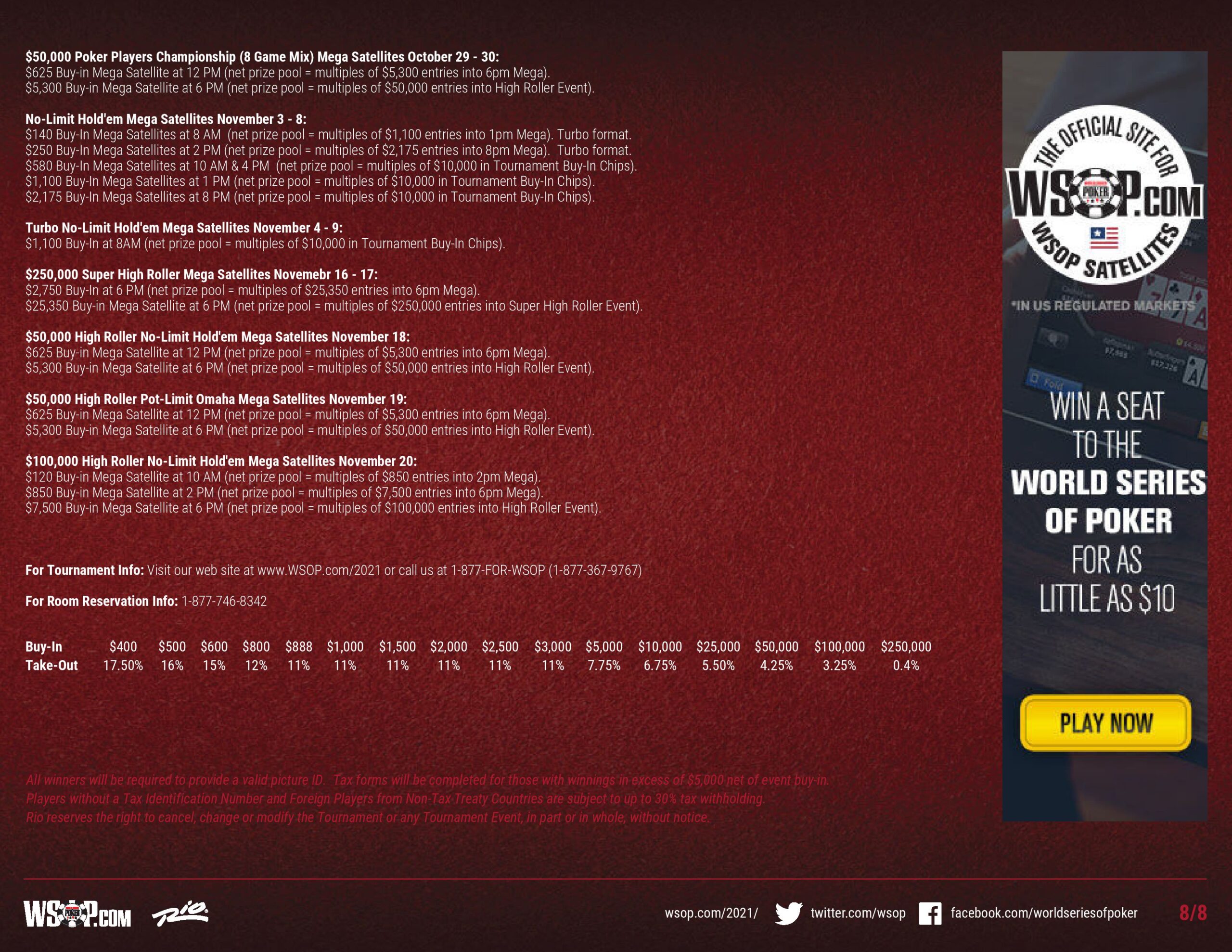 Die WSOP 2021 findet vom 30. September bis 23. November im Convention Center des Rio All-Suite Hotel & Casino in Las Vegas statt. Die Buy-Ins der 88 Bracelet-Events bewegen sich zwischen $400 und $250.000.