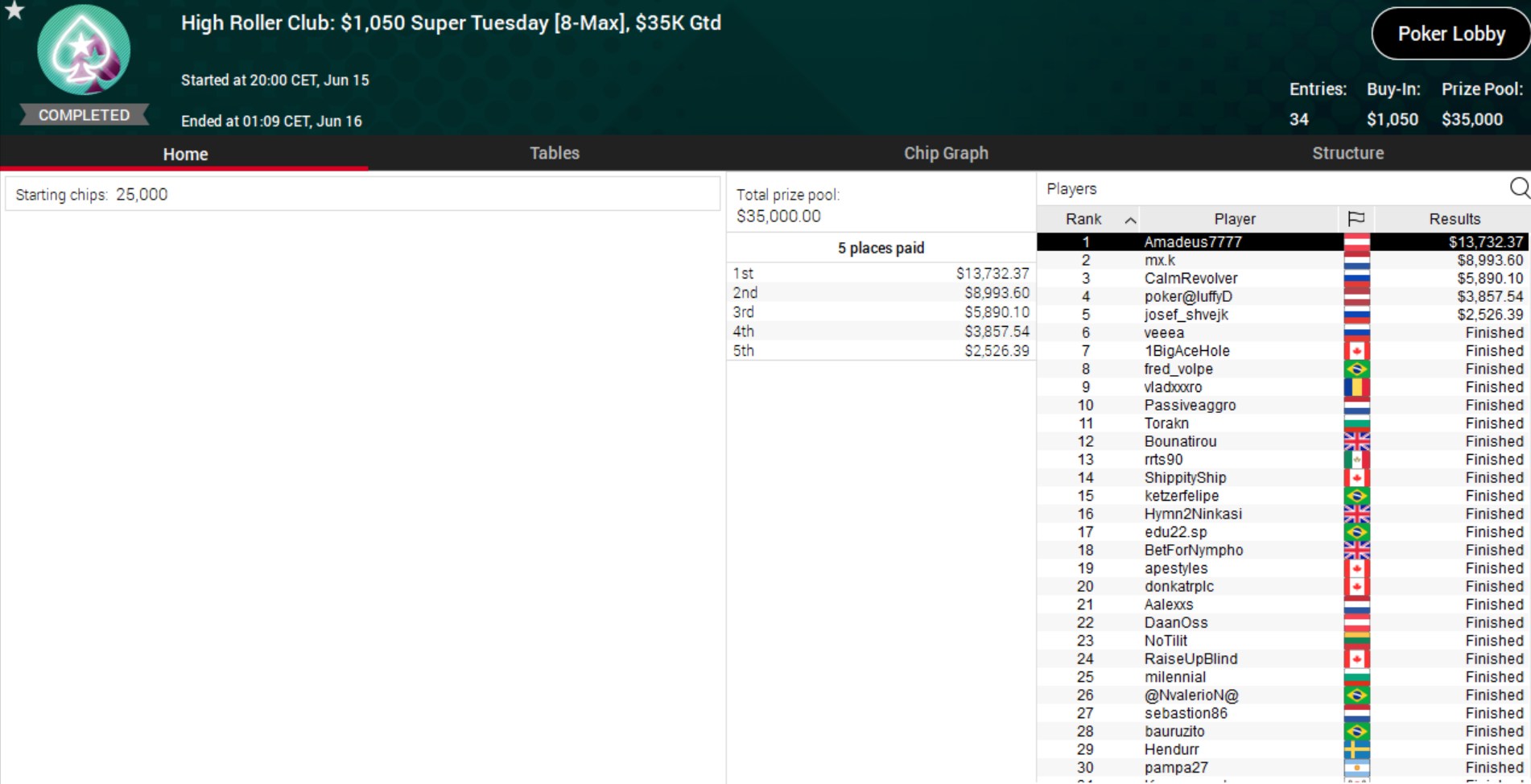 Den ersten Volltreffer landete „Amadeus7777“ beim $1.050 Super Tuesday. 34 Spieler hatten sich bei diesem exklusiven Turnier eingekauft und während Dominik Nitsche leer ausging, konnte niemand „Amadeus7777“ aufhalten.