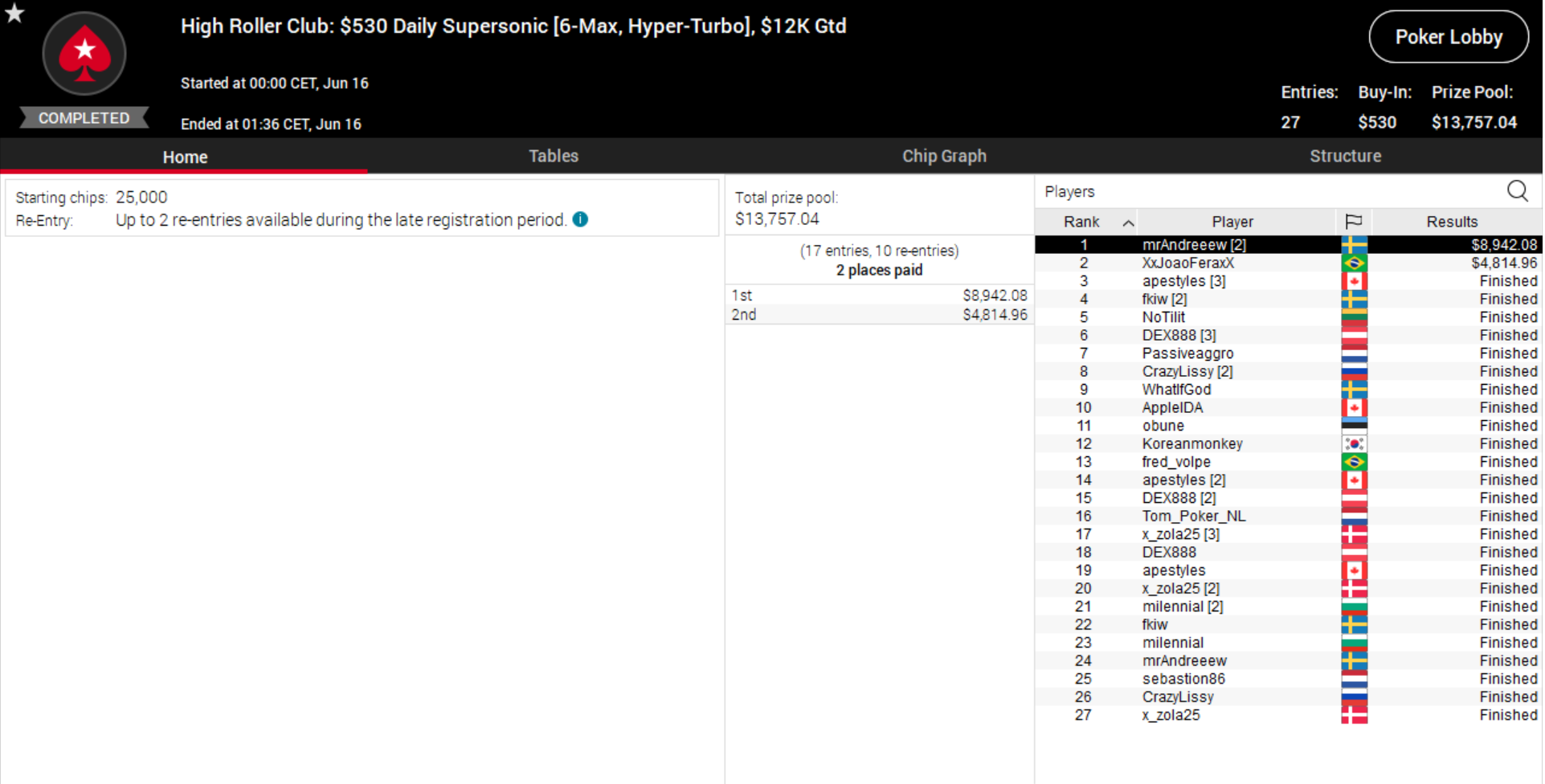 Bei den restlichen Turnieren gab es für die DACH-Fraktion nichts zu holen. Gierse kaufte sich zwar dreimal für das $530 Supersonic ein, ging aber genauso leer aus wie „jakobomber94“ als BUbble Boy beim späten Bounty Builder.