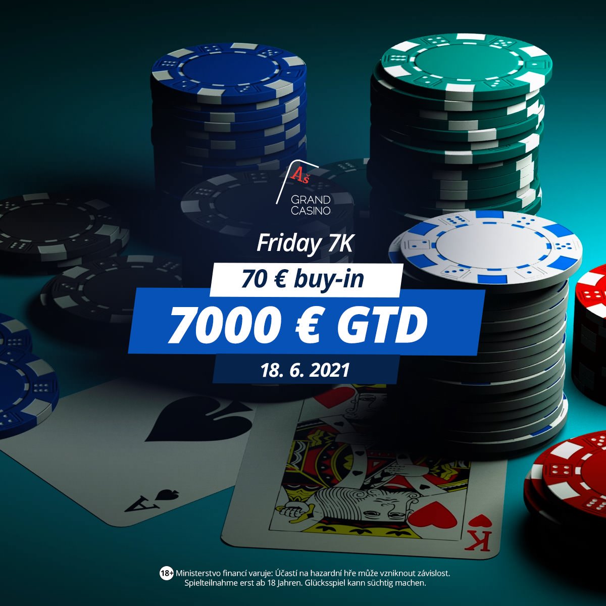 Am Freitag startet im Grand Casino Aš um 19:00 Uhr das €63+€7 Friday 7k Event, bei dem €7.000 garantiert werden. Die Startdotation beträgt 20.000 und jeder Level dauert 20 Minuten. Zwei Re-Entries sind möglich und die Late-Registration ist für acht Level geöffnet.