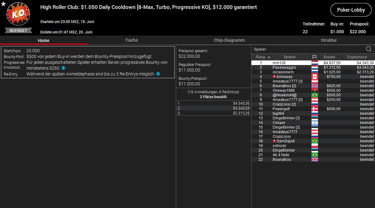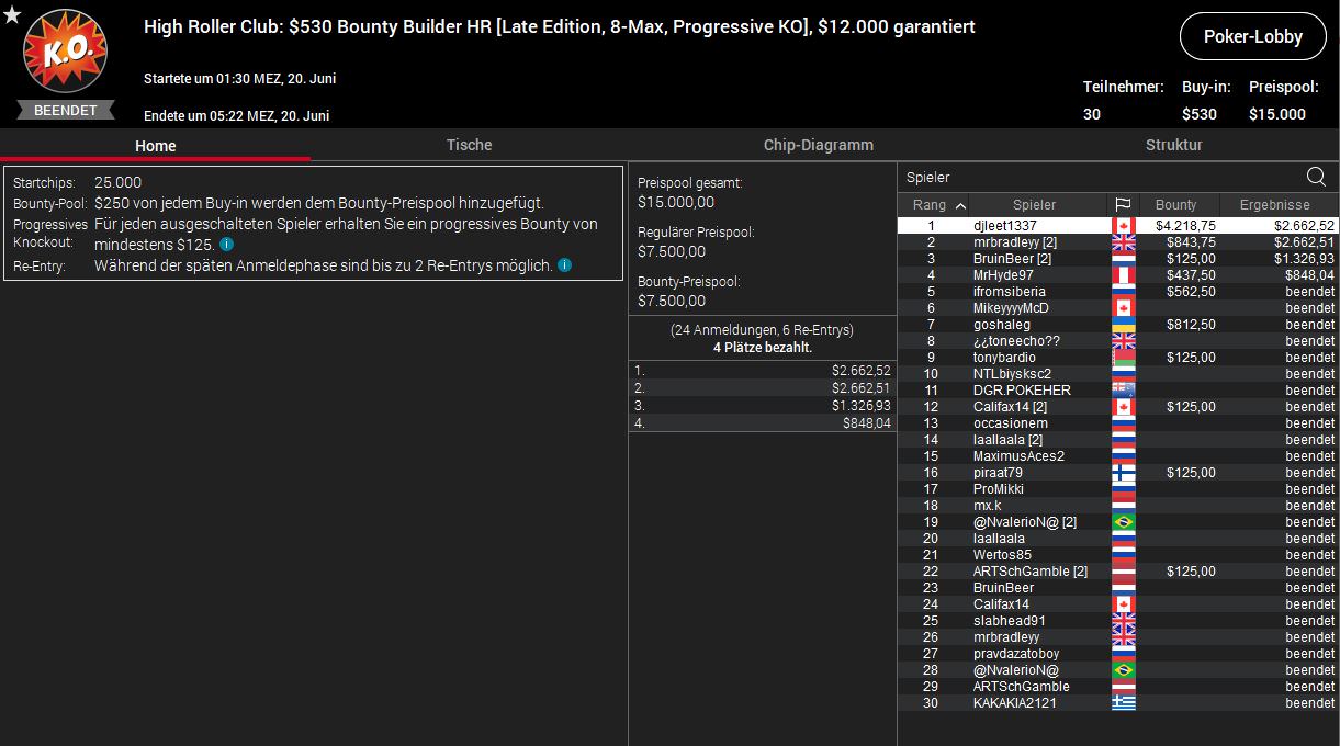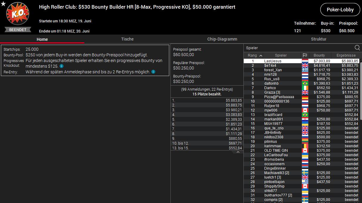 Bei 99 Anmeldungen plus 22 Re-Entries lagen letztlich $60.500 im Pot beim Bounty Builder HR, der Großteil davon ging an LastJesus, einem der vielen in den Niederlanden angesiedelten Regulars aus Portugal. Die Siegprämie betrug $5.883, die Bounty sogar $7.003. Als bester Deutscher belegte Pizza@Pastaaaaa ($880/$375) Platz neun.