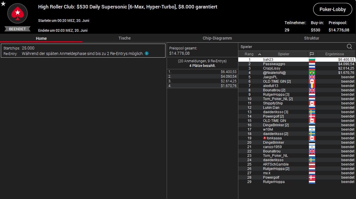 Es blieb der einzige Cash aus deutschsprachiger Sicht, was aber jetzt keine riesige Enttäuschung ist. Denn zum einem waren gestern nur wenige DACH-Spieler am Start und dann fielen die Felder beim Daily Cooldown, Daily Supersonic und Bouty Builder HR Late Edition auch nicht besonders groß aus, sodass jeweils nur drei und vier Plätze bezahlt wurden.