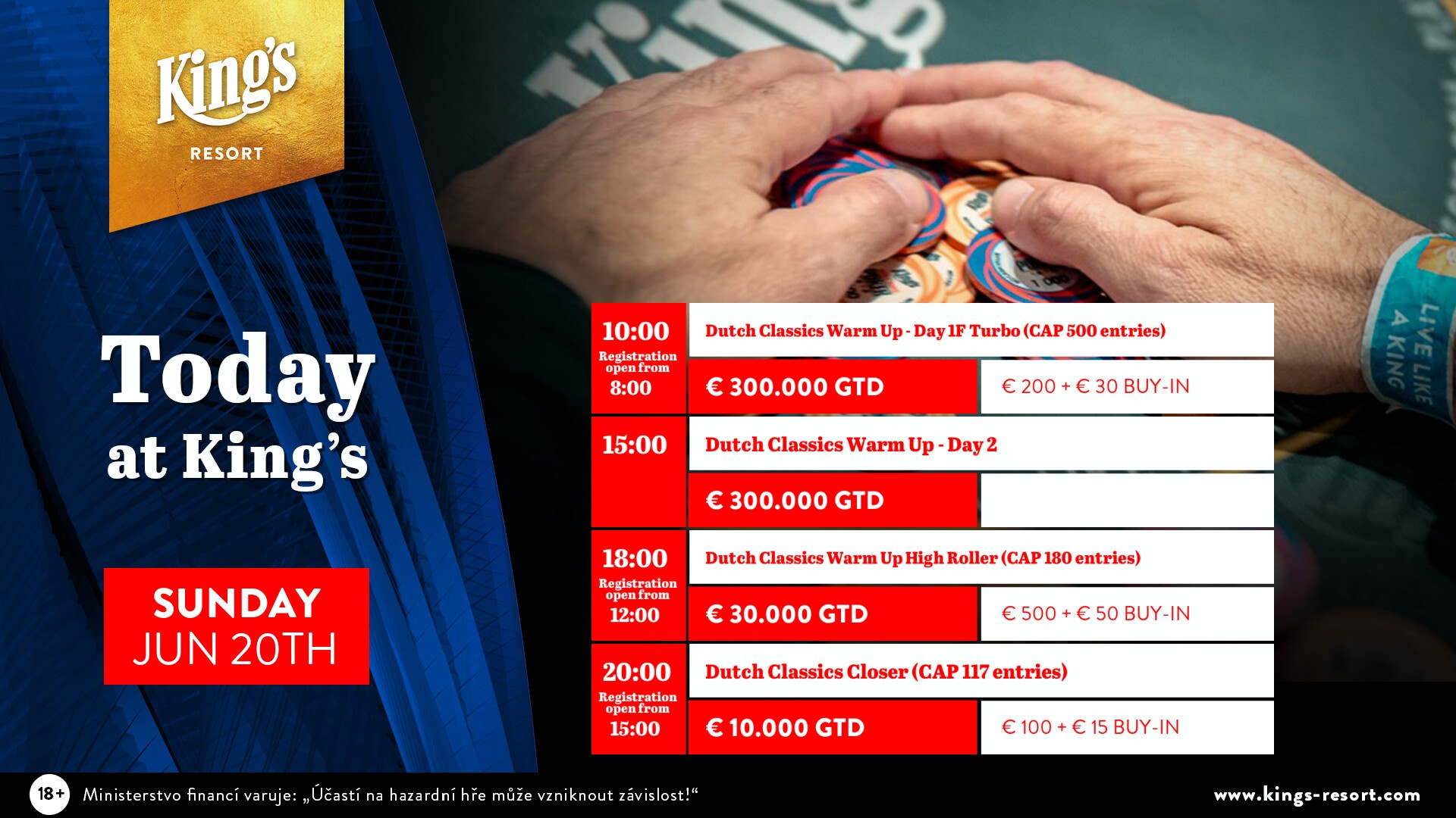 Außerdem finden im King’s heute noch zwei Side Events statt. Um 18 Uhr geht es beim €550 Dutch Classics Warm Up High Roller (CAP 180 Entries) um mindestens €30.000 an Preisgeldern, um 20 Uhr beim €115 Dutch Classics Closer (CAP 117) um mindestens €10.000.