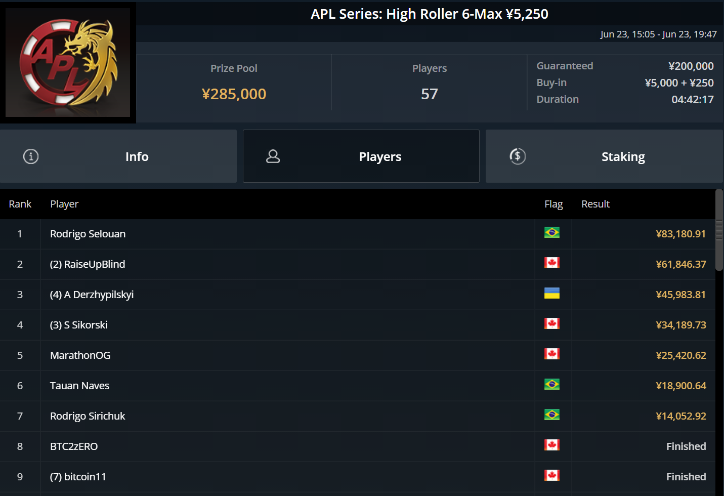 Und auch das wichtigste Turnier des Tages wurde eine Beute der DACH-Spieler. Bei der APL Trophy 15, dem Xi’an Silk Road Bounty, triumphiert UFC –GTO vor „Fronsi1“ und sicherte sich die Siegprämie von umgerechnet über €18.000.