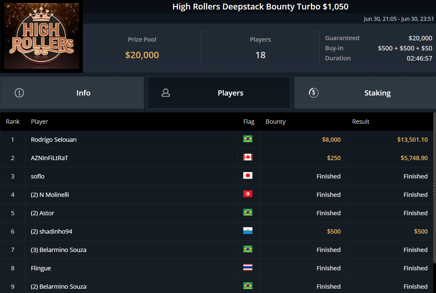 Beim $210 Bounty Hunters Special reichte es zu Platz 2, und beim $126 Bounty Hunters Special ließ er einen fünften Platz folgen.