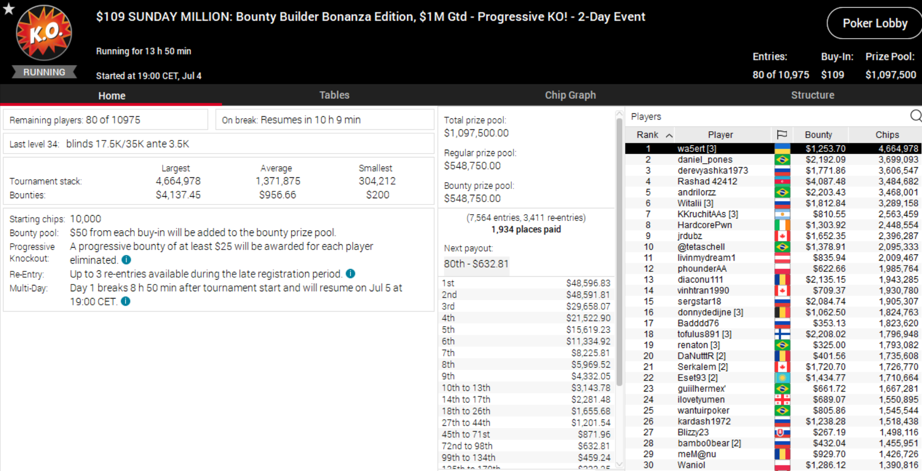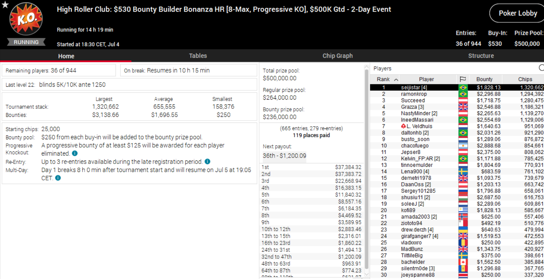 Miegel liegt außerdem vor dem Finale des $530 Bounty Builder Bonanza als Dritter glänzend im Rennen. Ebenfalls gut dabei sind Dinesh „NastyMinder“ und Lex Veldhuis auf den Plätzen 5 und 7.