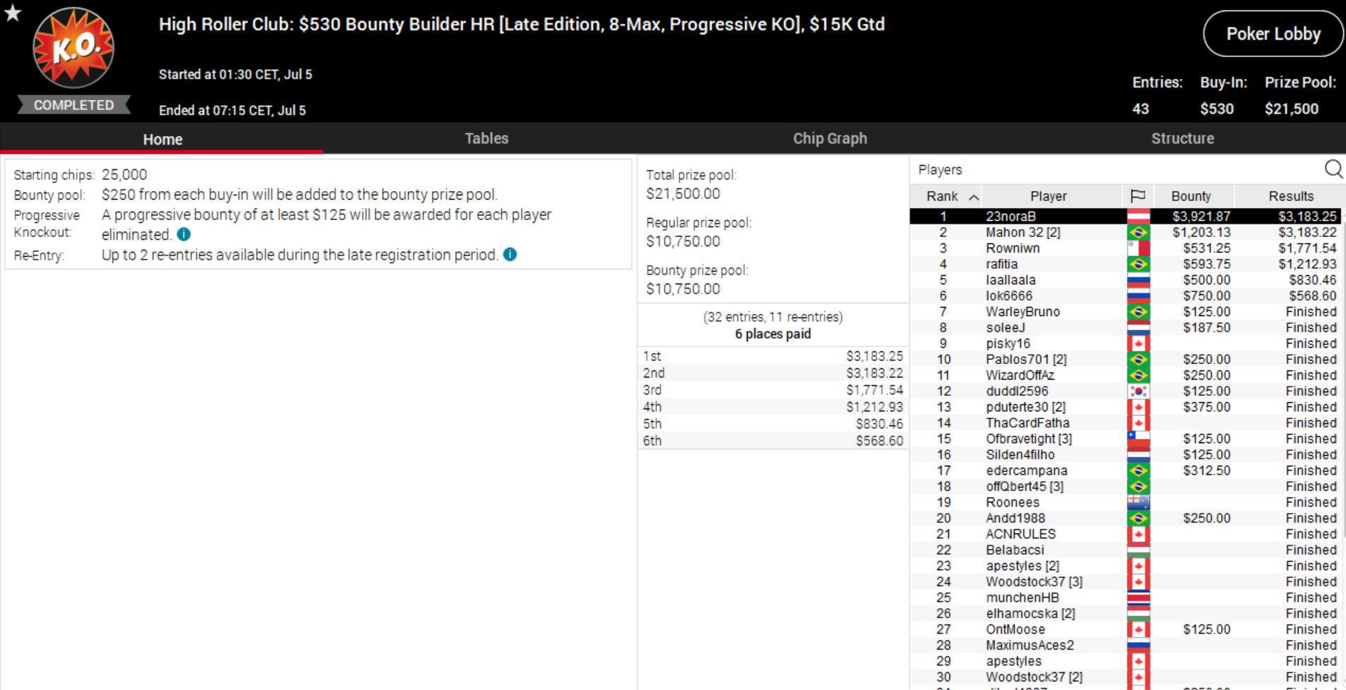 Zu später Stunde holte sich „noraB23“ den Sieg beim $530 Bounty Builder Late Edition. Als Belohnung gab es gut $7.000.