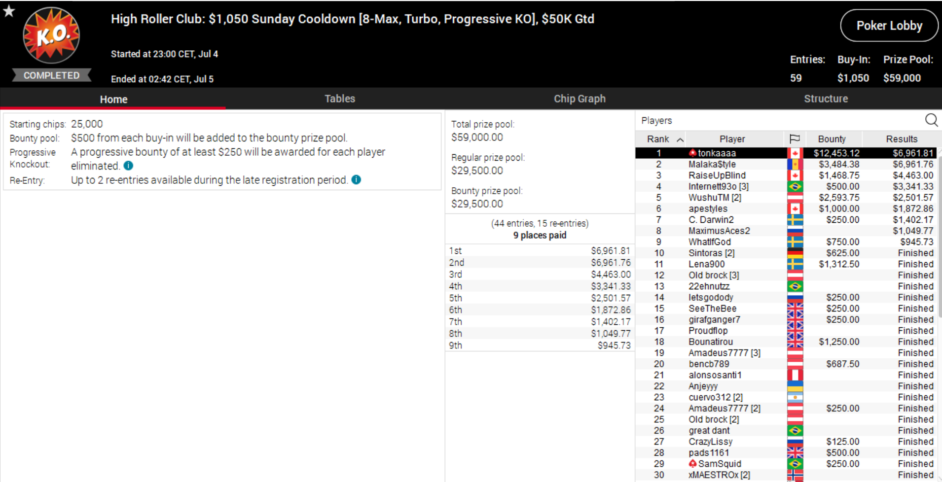 Und auch Parker „tonkaaaa“ Talbot erwischte einen Sahnetag. Musste er sich beim $1.050 Sunday High Roller noch mit Rang 3 begnügen, ließ er beim $1.050 Cooldown alle 58 Konkurrenten hinter sich und räumte über $19.000 ab.