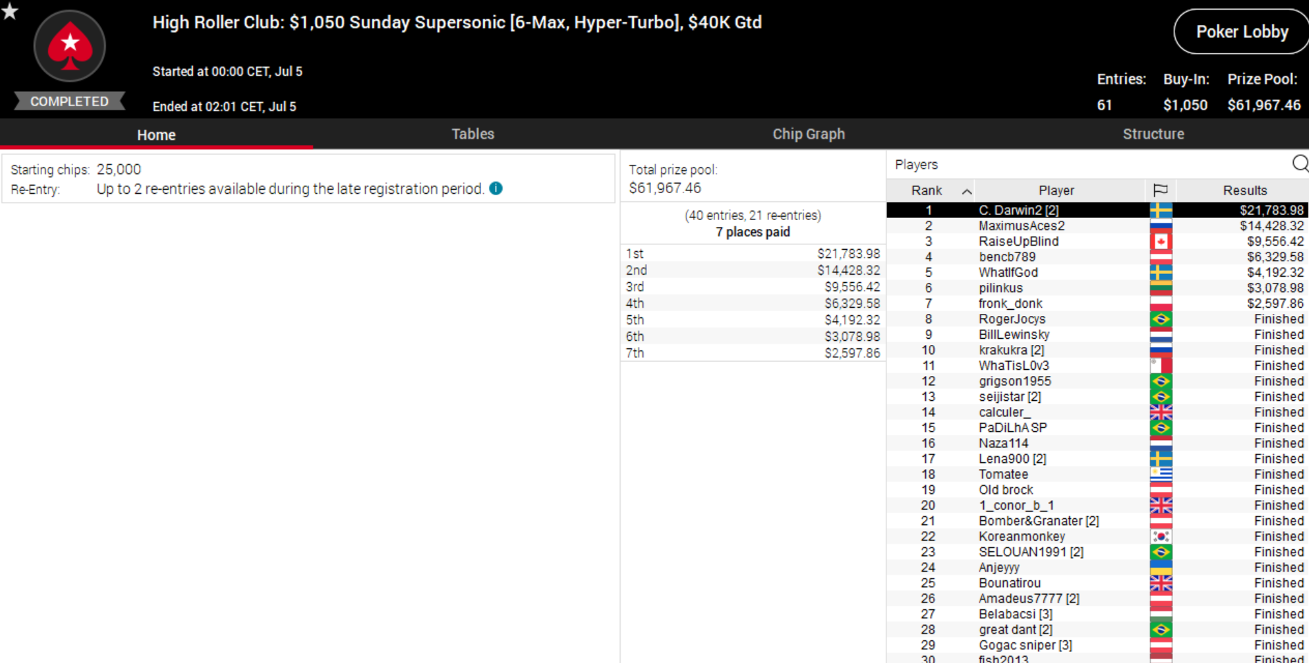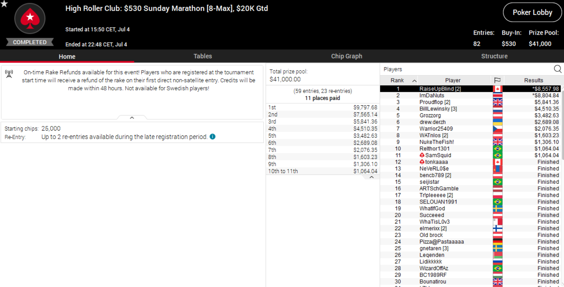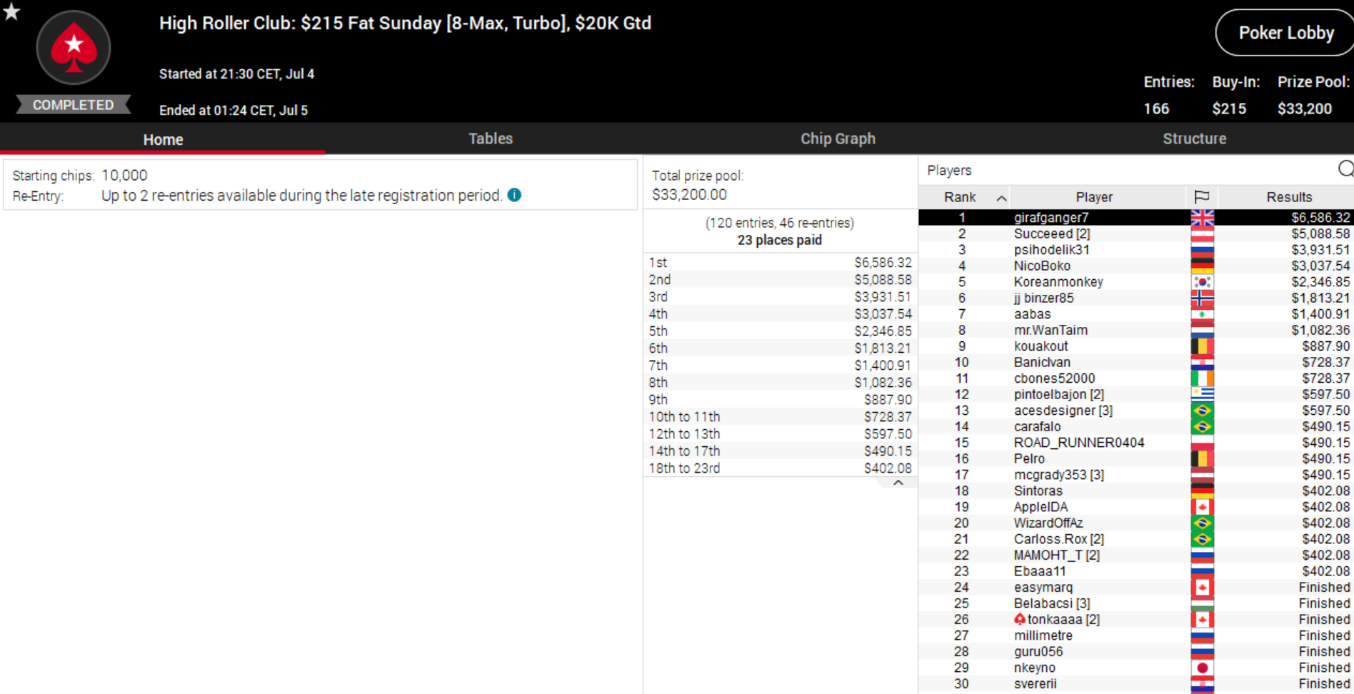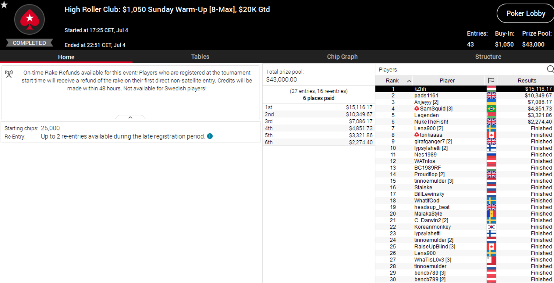 Weitere Top-Ergebnisse gab es für holten „Grozzorg“ beim $530 Sunday Marathon (Platz 5; rund $3.500 Preisgeld), Ole „wizowizo“ Schemion beim $1.050 Sunday High Roller (Platz 7; gut $7.000 Preisgeld), Thomas „WushuTM“ Mühlöcker beim $1.050 Cooldown (Platz 5, rund $5.000 Preisgeld) und Jakob „Succeeed“ Miegel beim $215 Fat Sunday (Platz 2; gut $5.000 Preisgeld).