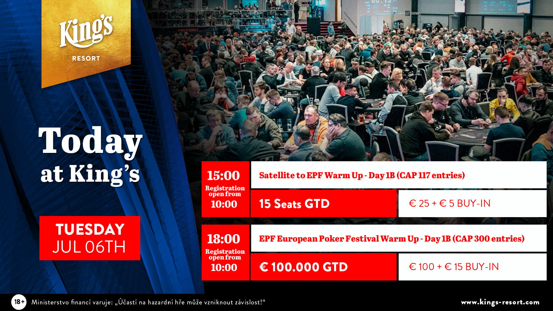 Gestern ging es im King’s Resort in Rozvadov los mit dem Warm Up des European Poker Festival. 132 Spieler sorgten für insgesamt 186 Entries bei €100+15. Das Turnier wartet mit einer €100.000 Garantie auf.