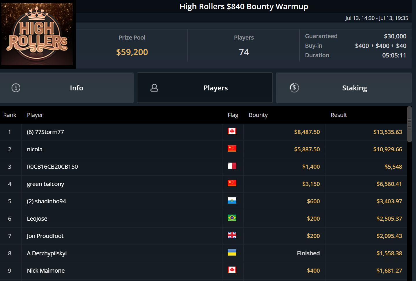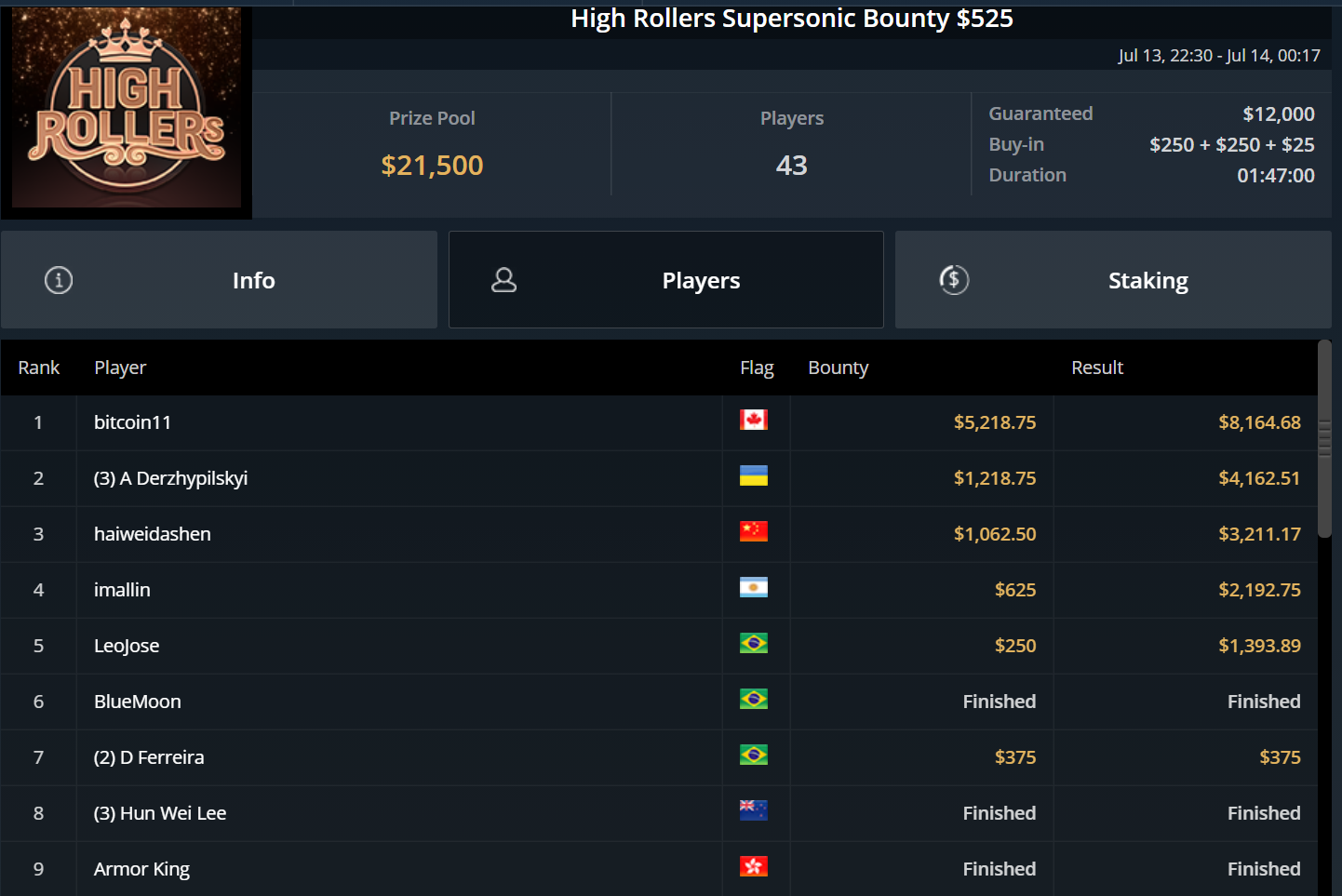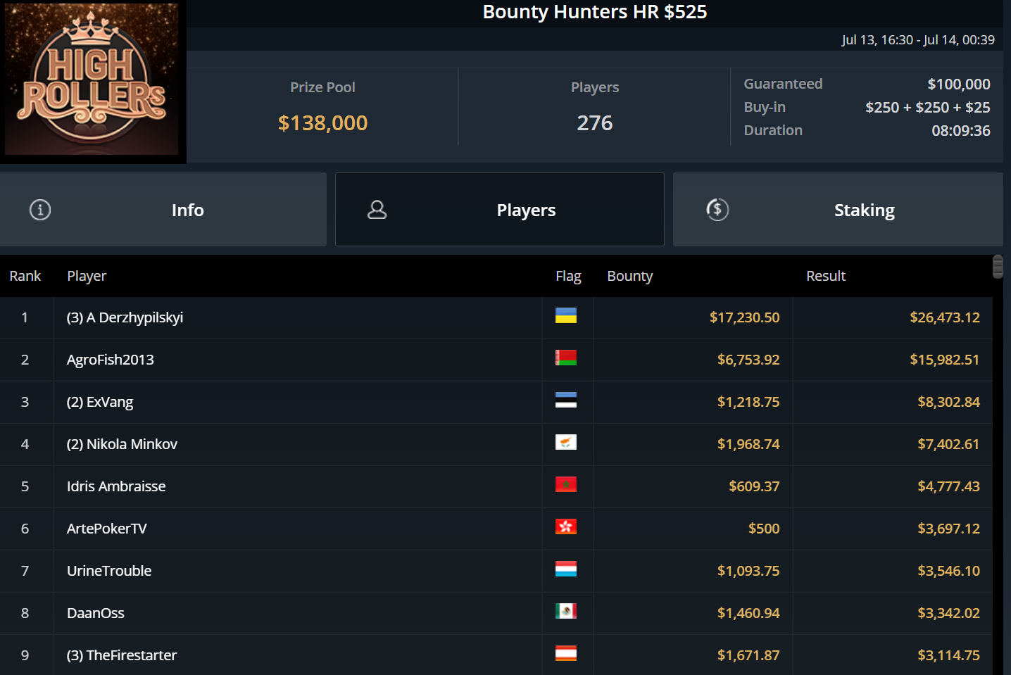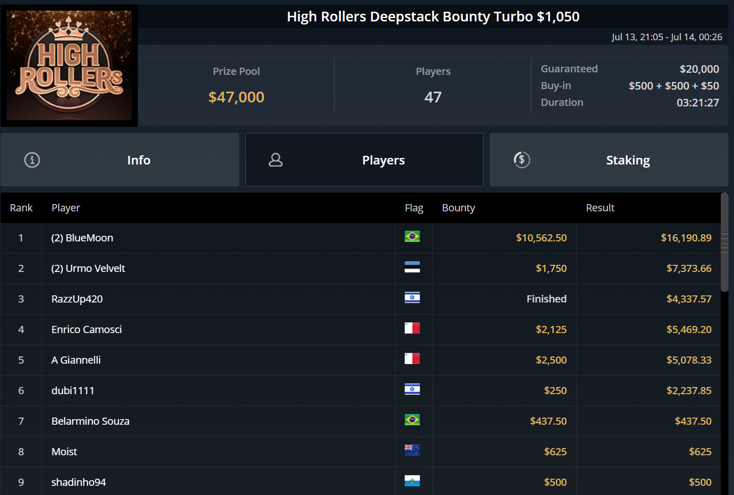 Chris Pütz konnte sich immerhin zu später Stunde mit Platz 7 beim $525 High Rollers After Hours noch $1.800 sichern und auch „URJH19“ kam beim $215 Last Call Bounty Hyper auf den letzten Drücker zu einem Cash. Für Platz 3 gab es ebenfalls rund $1.800.