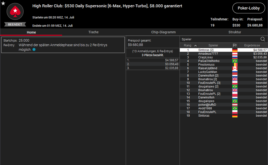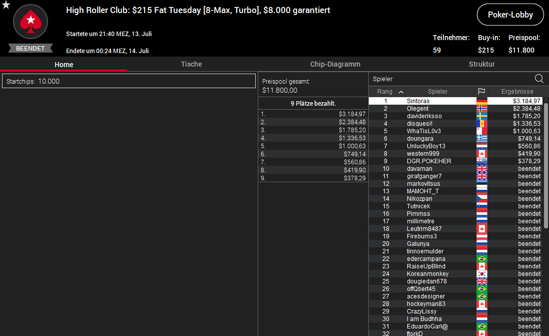 Zunächst schlug der Deutsche beim $215 Fat Tuesday zu und kassierte als Sieger knapp $3.200 Preisgeld.