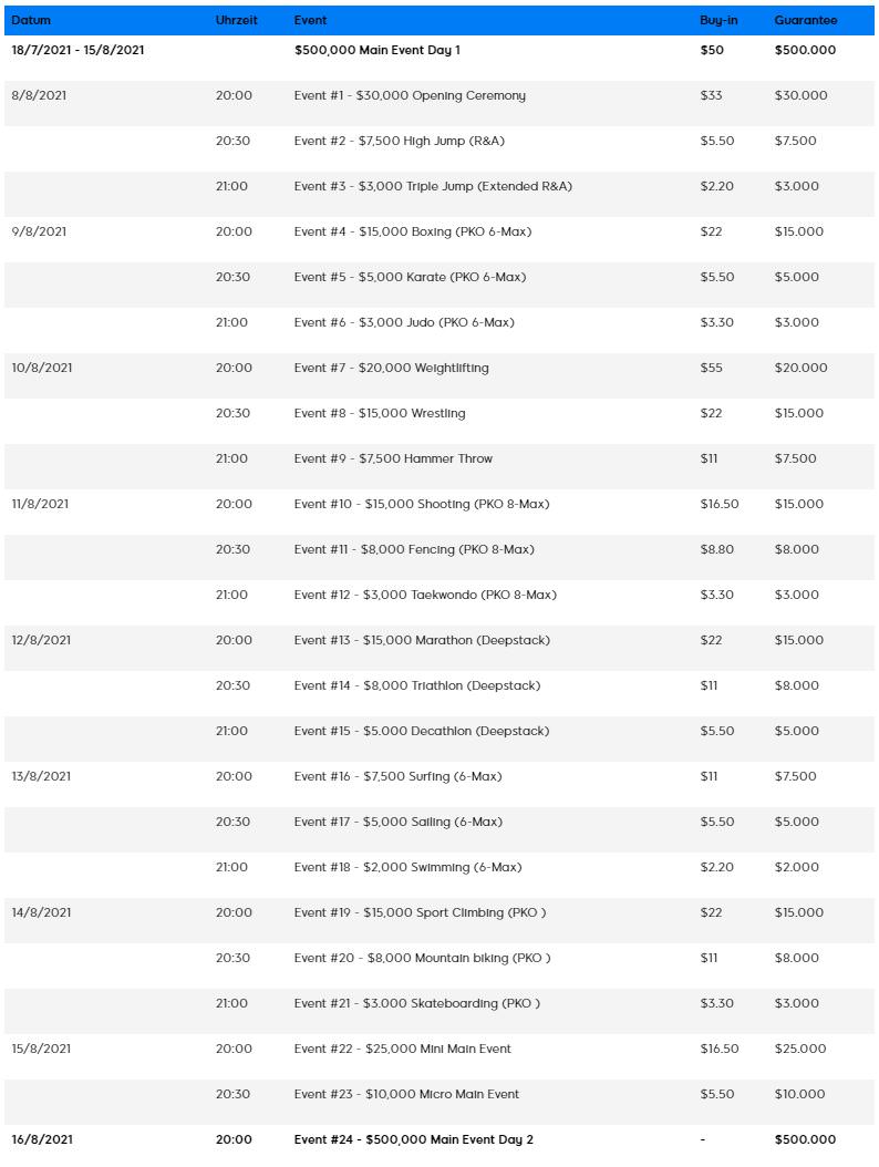 Offiziell fällt der Startschuss wie geschrieben am 8. August mit der $33 Opening Ceremony $30.000 GTD, gefolgt vom $5,50 High Jump (R$A) $7.500 GTD und $2,20 Triple Jump (Extended R&A) $3.000 GTD.