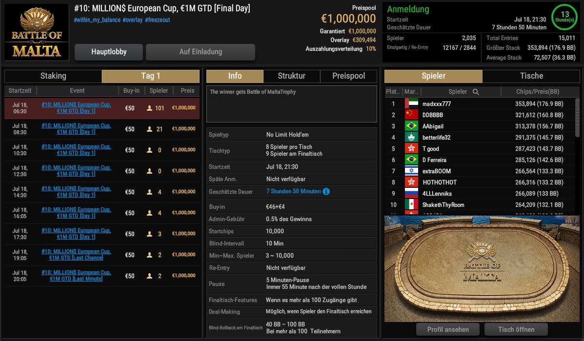 Beim mit Spannung erwarteten €50 MILLION$ European Cup €1 Million GTD fehlen noch €309.000, um die Garantiesumme abzudecken und es bleiben noch neun Day 1 Flights, ehe heute Abend um 21:30 Uhr der zweite Spieltag beginnt.