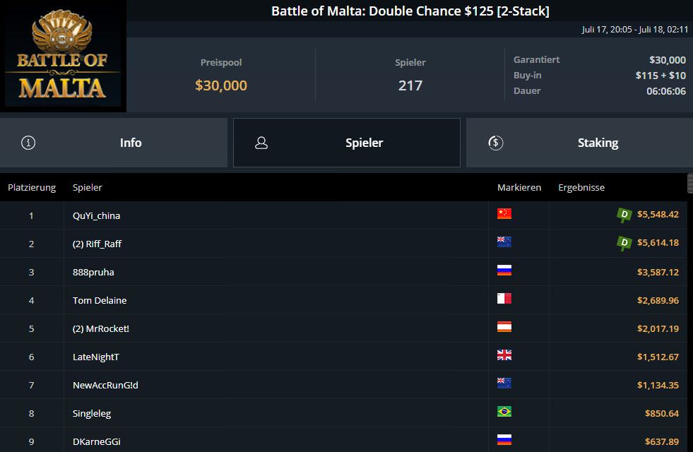 Einen ordentlichen Cash fuhr zudem MrRocket! beim $125 Double Chance (2-Stack) ein, Platz fünf wurde immerhin mit $2.017,19 belohnt.