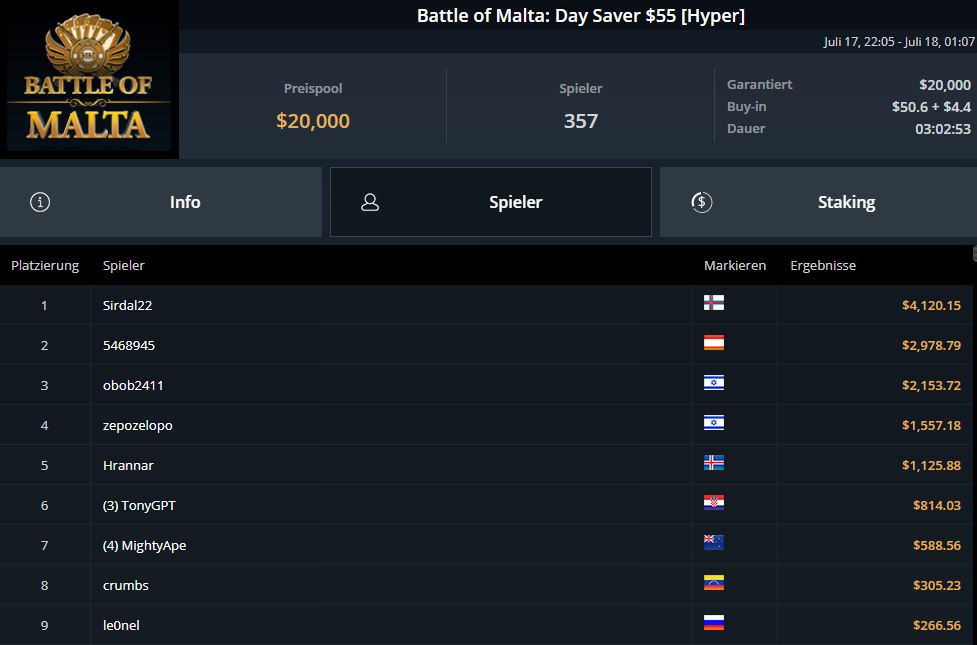 Das einzige echte Top-Ergebnis erzielte 5468945 aus Österreich beim $55 Day Saver (Hyper). Bei 357 Entries ging es hier um die garantierten $20.000 an Preisgeldern und 5468945 belegte am Ende Platz zwei für $2.978,79 hinter Sirdal22 ($4.120,15) von den Färöer-Inseln.