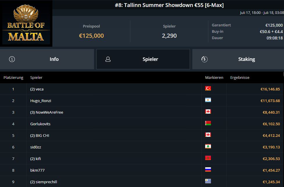 Wie bei den meisten anderen Turnieren auch, mussten sich die DACH-Spieler beim Hauptevent des Tages, dem €55 Tallin Summer Showdown (6-Max), mit Nebenrollen begnügen. Das beste Ergebnis erzielte AgathaFlush aus Österreich mit Platz 16 für €782,05. Den Sieg samt €16.146,85 Prämie holte der Türke veca.