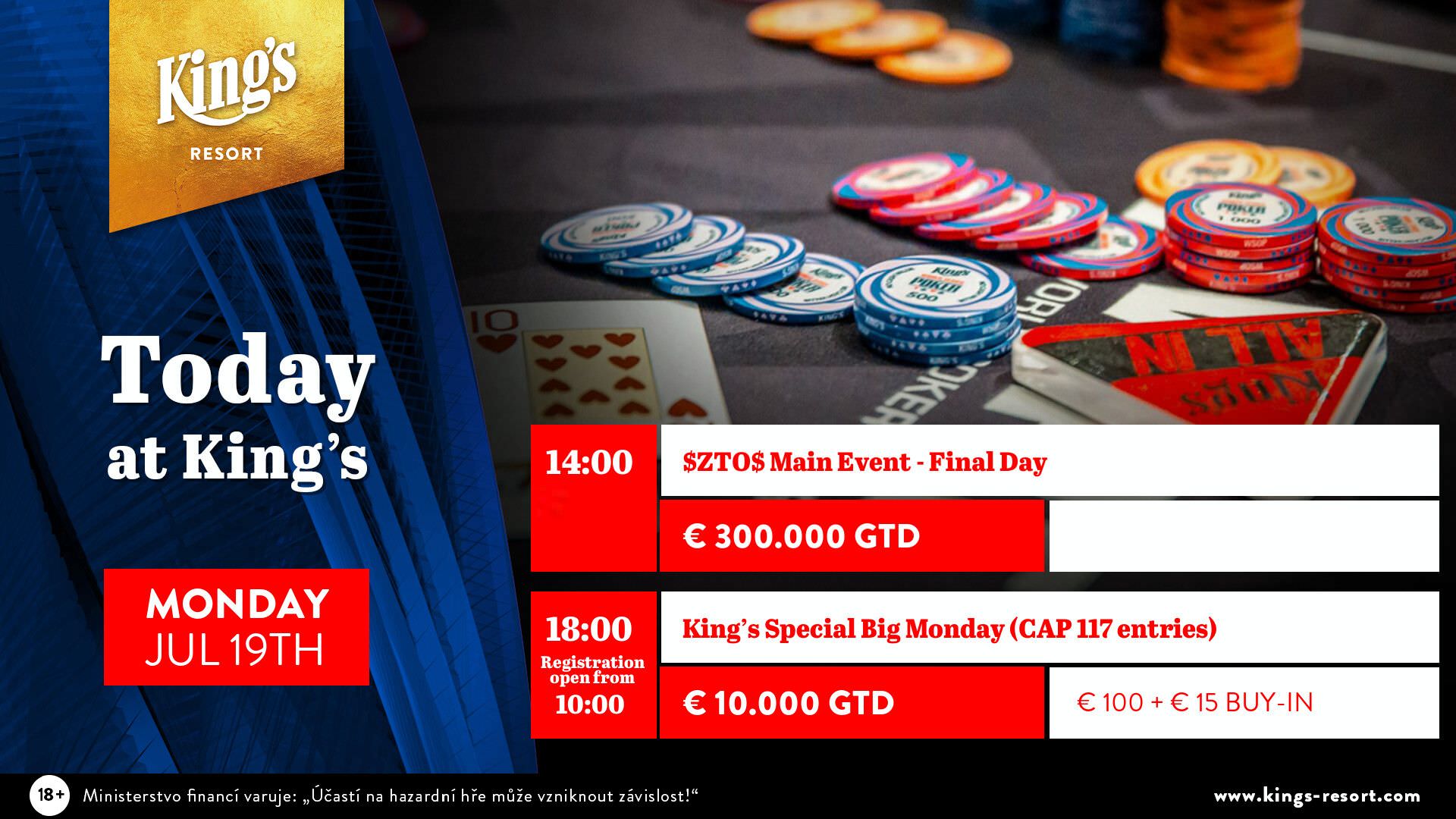 Heute steht das King’s ganz im Zeichen des Finales des $ZTOS Main Event. Außerdem gibt es um 18 Uhr das King’s Special Big Monday, bei dem es für ein Buy-In von €115 um garantierte €10.000 geht.