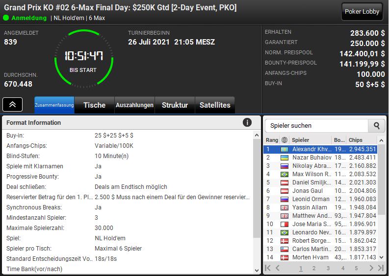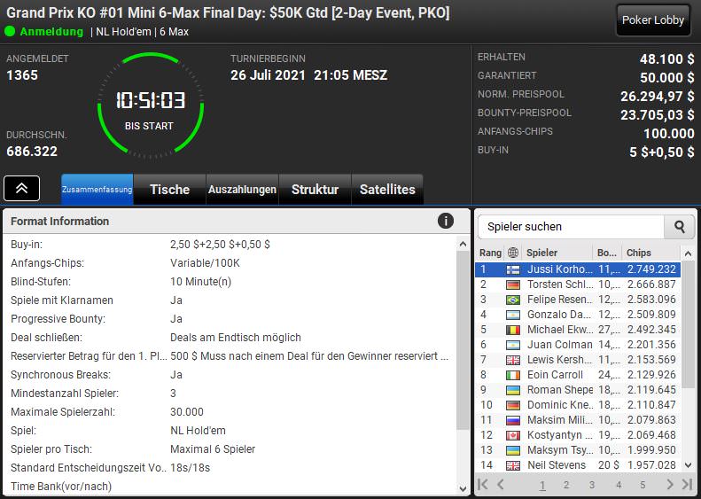Beim Grand Prix Ko auf partypoker gab es am Sonntag zwei Entscheidungen, so richtig spannend wird es erstmals aber heute Abend, wenn die Finaltage der beiden Auftaktturnier gespielt werden.