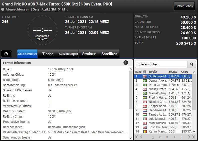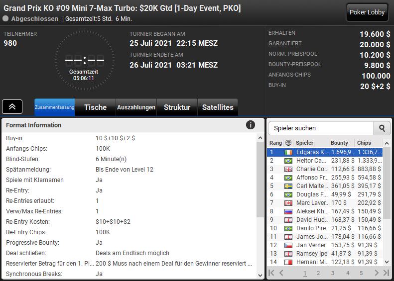 Das $22 NLHE 7-Max Turbo gewann der Ire Edgaras Kausinis für $3.033,66 vor Heitor Camargos ($1.565,79), ebenfalls Brasilien.
