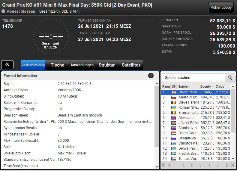 Beim $5,50 NLHE Mini 6-Max (Event #01) lagen $52.033,11 im Preispool und 1.478 Spielern Spieler hatten sich für Spieltag zwei qualifiziert. Mit Oliver Pennington setzt sich auch hier ein Brite durch, sein Preisgeld betrug insgesamt $4.256,23.