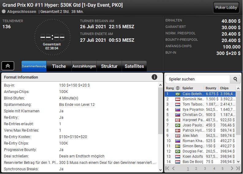 Das beste Ergebnis aus deutschsprachiger Sicht landete Dominik Neumaier aus Österreich beim $320 NLHE Hyper PKO. Am Brasilianer Caio De Olivera ($9.671,46) kam er zwar nicht vorbei, als Runner.-up gab es aber $5.092,25.