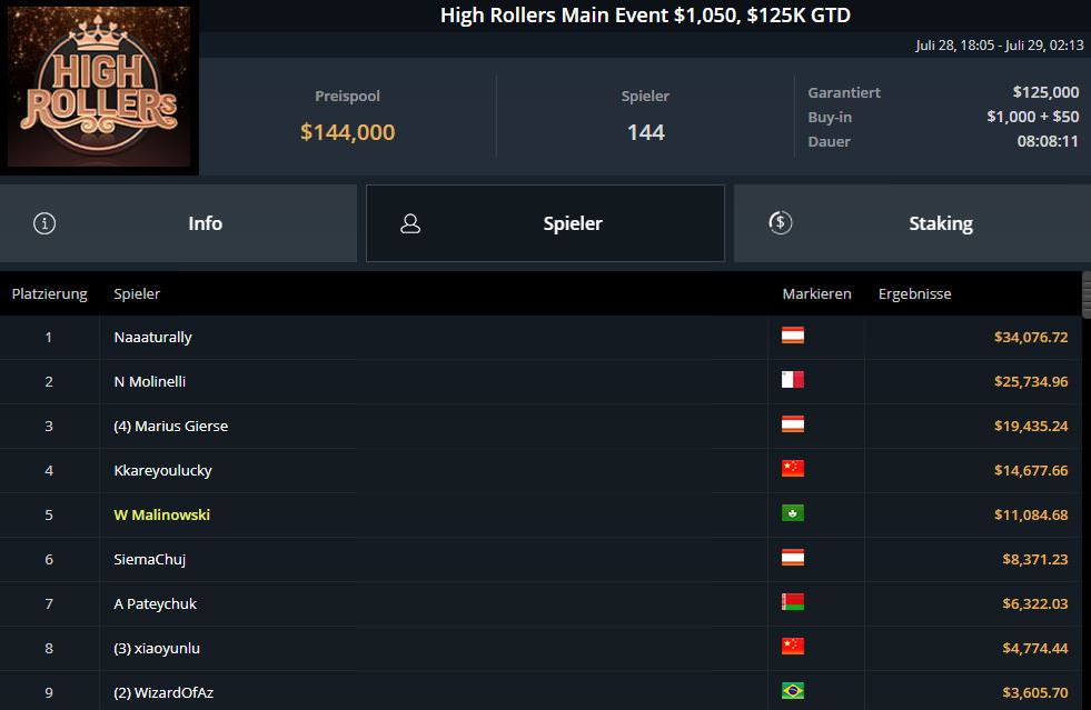 Noch üppiger fiel die Prämie von Naturally aus. Beim $1.050 High Rollers Main Event ging es bei 144 Entries um $1440.000 an Preisgeldern und der Österreicher kassierte für Platz eins $34.076,72. Heads-up setzte er sich gegen N Molinelli ($25.734,96) durch, Platz drei belegte Marius Gierse ($19.435,24).