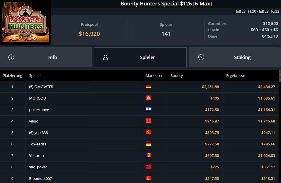 Die erste Duftmarke setzte OMGWTF!! mit dem Sieg beim frühen $126 Bounty Hunters Special (6-Max). Insgesamt wurden hier 416.920 ausgespielt, davon gingen $3.484,27 an den deutschen Spieler.