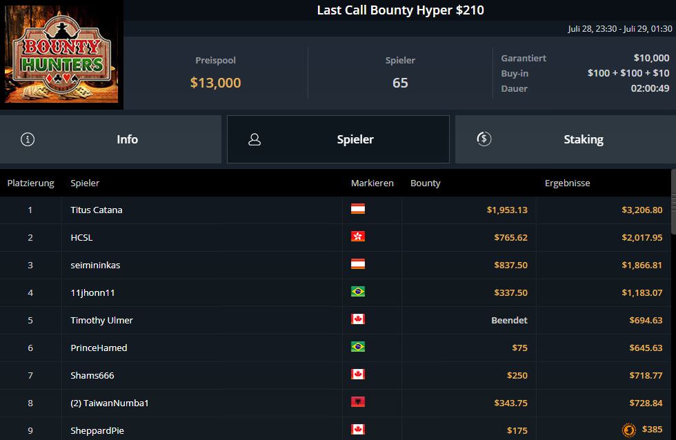 Zu später Stunde begann dann noch das $210 Last Call Bounty, das aufgrund der schnellen Struktur aber nur zwei Stunden dauerte, bis Titus Cantana aus Österreich als Sieger feststand. Die Prämie belief sich inklusive Bounties auf $3.206,80.