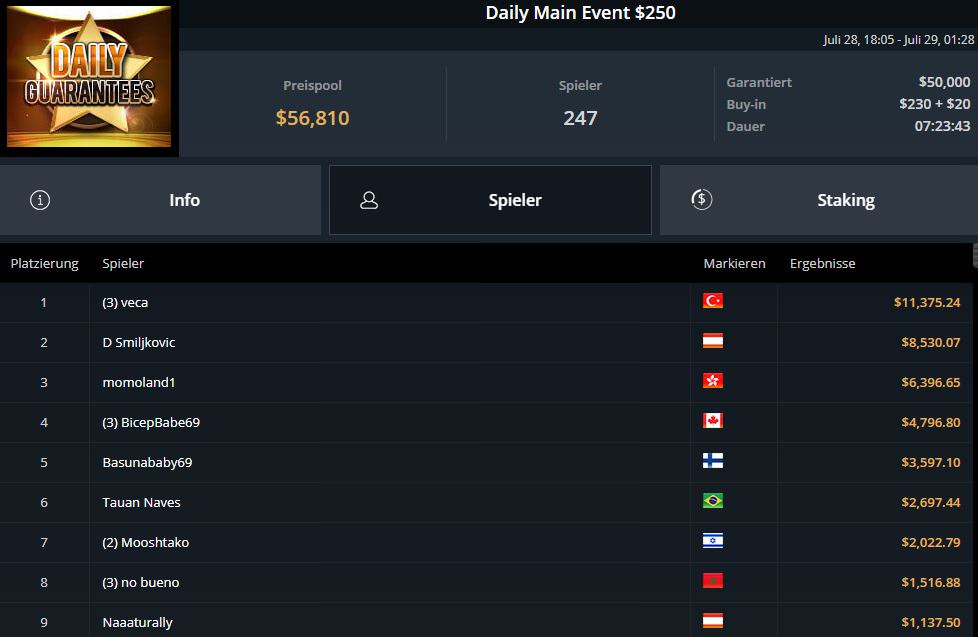 Nicht ganz gereicht hat es bei Daniel Smiljkovic. Der in Österreich lebende deutsche Pro unterlag beim $250 Daily Main Event veca ($11.375,24) aus der Türkei, bekam als Runner-up aber schon $8.530,07 ausbezahlt.