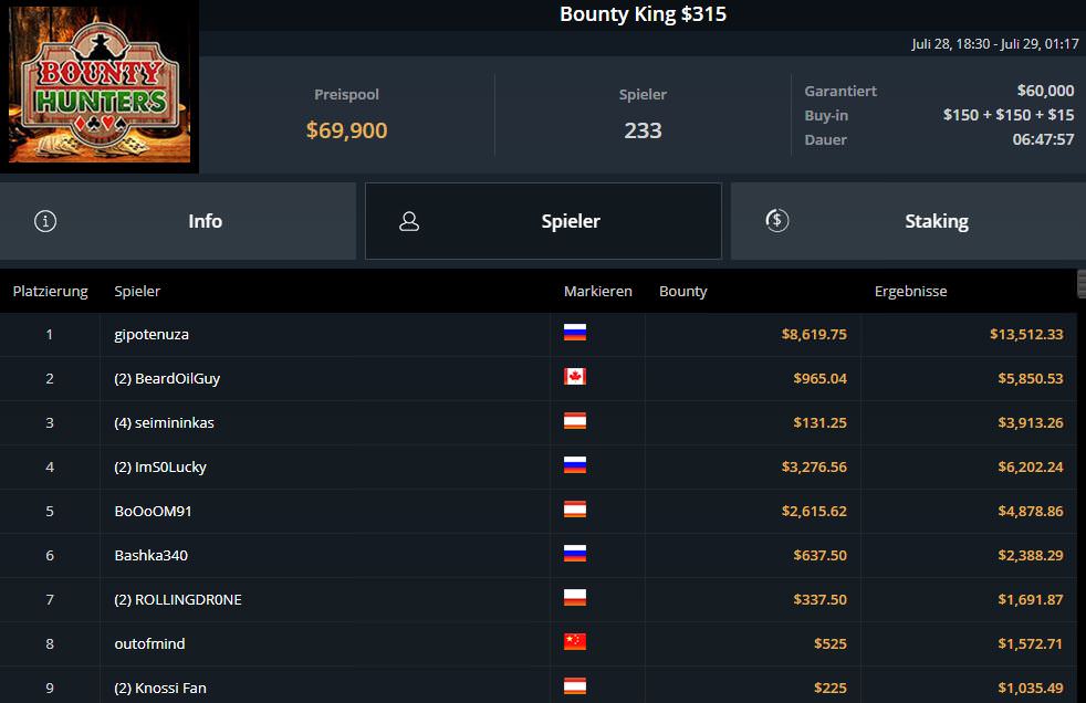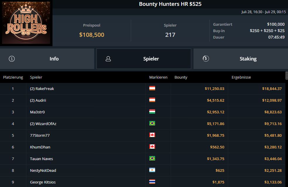 Besonders gut lief es für die DACH-Spieler dann im Highroller-Segment. RakeFreak gewann das beliebte $525 Bounty Hunters HR. Der Preispool war hier mit $108.200 gefüllt und der Österreicher setzte sich im Heads-up gegen den starken Litauer Audrius Audrii Stakelis ($12.098,97). Zur Belohnung kassierte RakeFreak satte $18.844,37 inklusive Bounties.