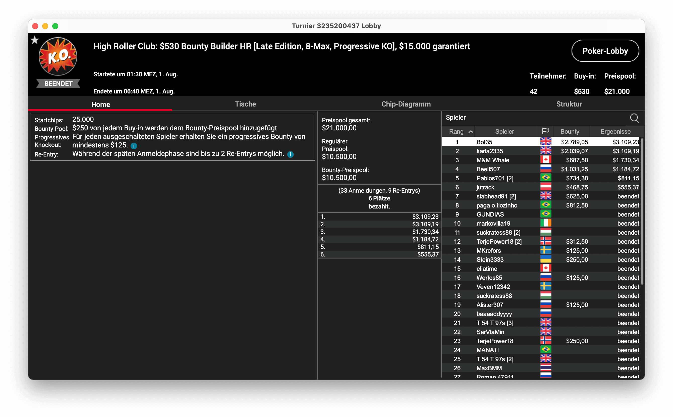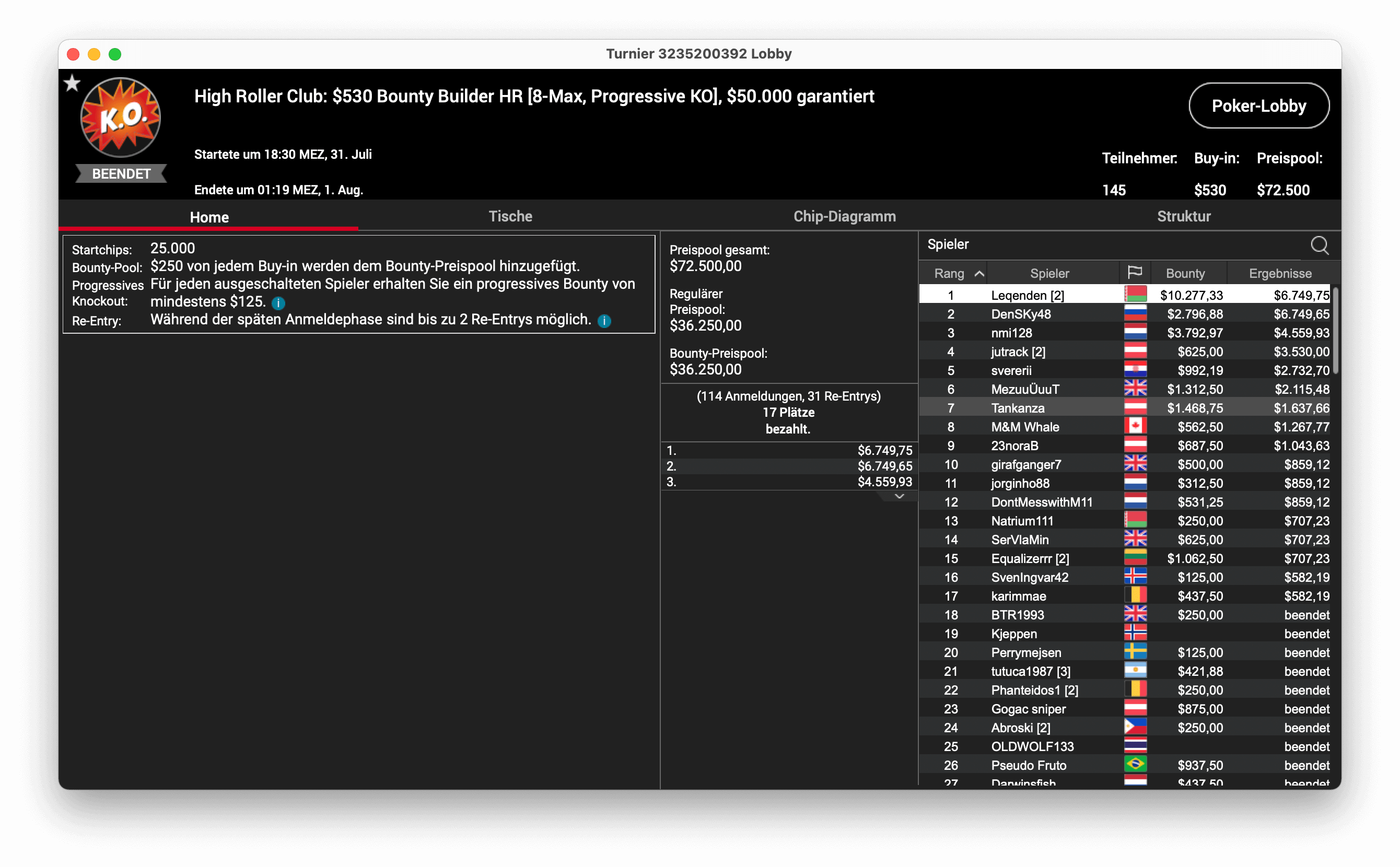 Beim $530 Bounty Builder HR konnte „Leqenden“ Anatsky sich den Sieg schnappen. $10.277 + $6.749 war die Siegprämie des 145-Entry starken Turniers. Julian „jutrack“ Track wurde in diesem Turnier Vierter für $625 + $3.530.